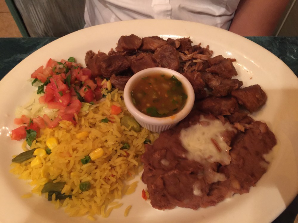 Looking at our last trip, got the tres enchiladas (supposed to be one chicken with a sour cream sauce, one cheese with rancheros sauce, and one pork with verde but I modify and ditch the chicken and get an additional pork) and Jim got carnitas again! Do the pics look the same?