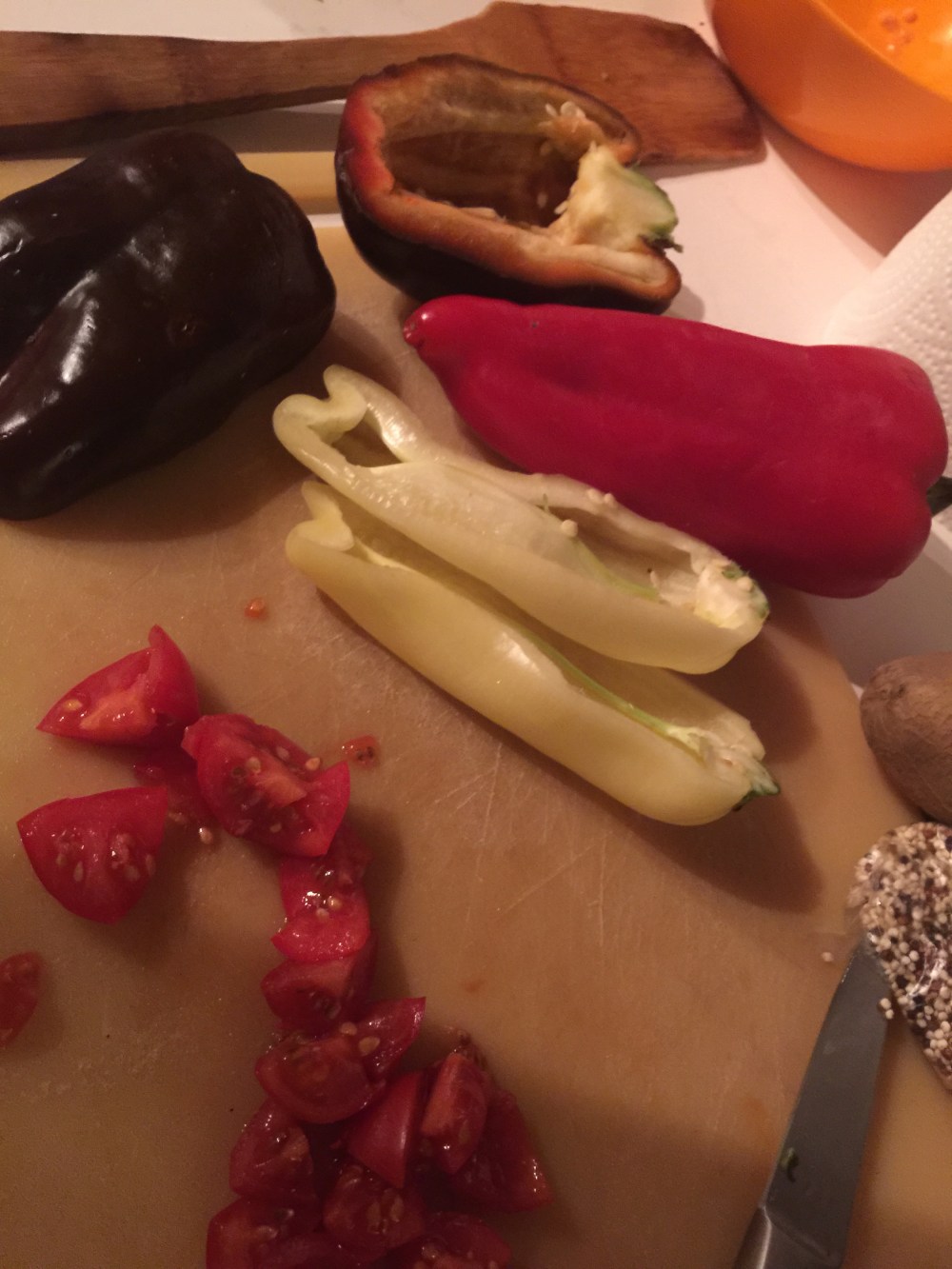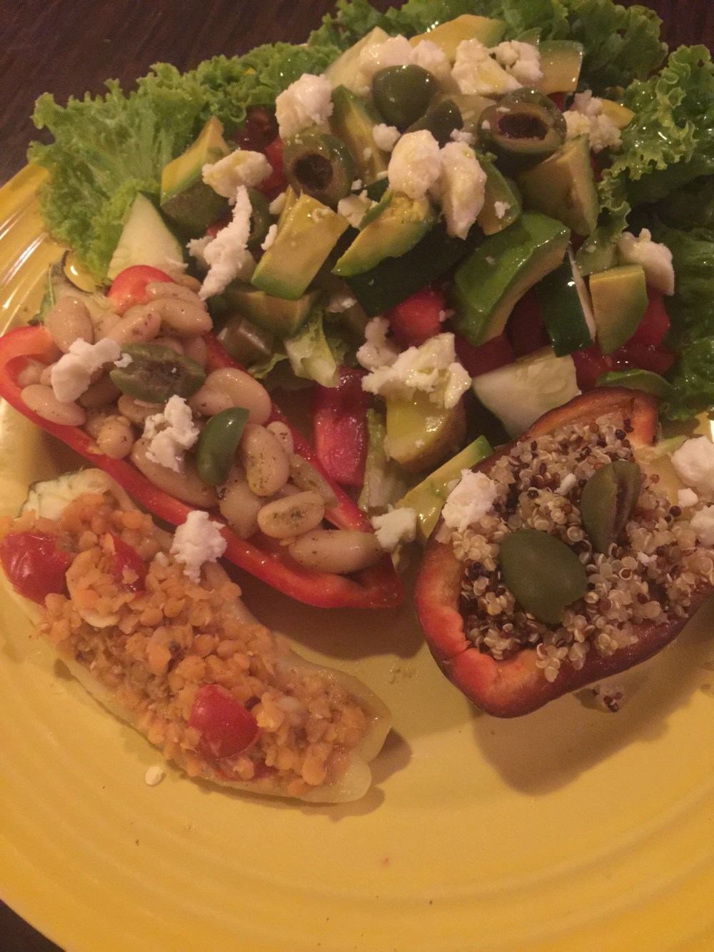 There’s a red corno do toro pepper filled with cannellini beans with Penzeys Greek spice blend and olive oil…this is a go to for me.