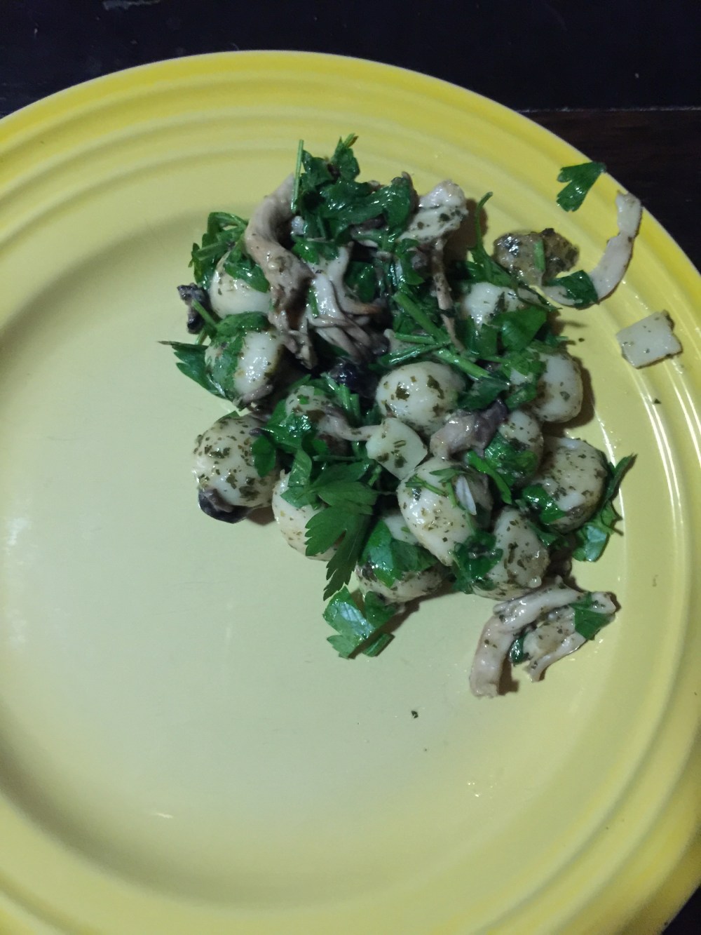 Gnocchi, oyster mushrooms, elephant garlic, pesto and parsley