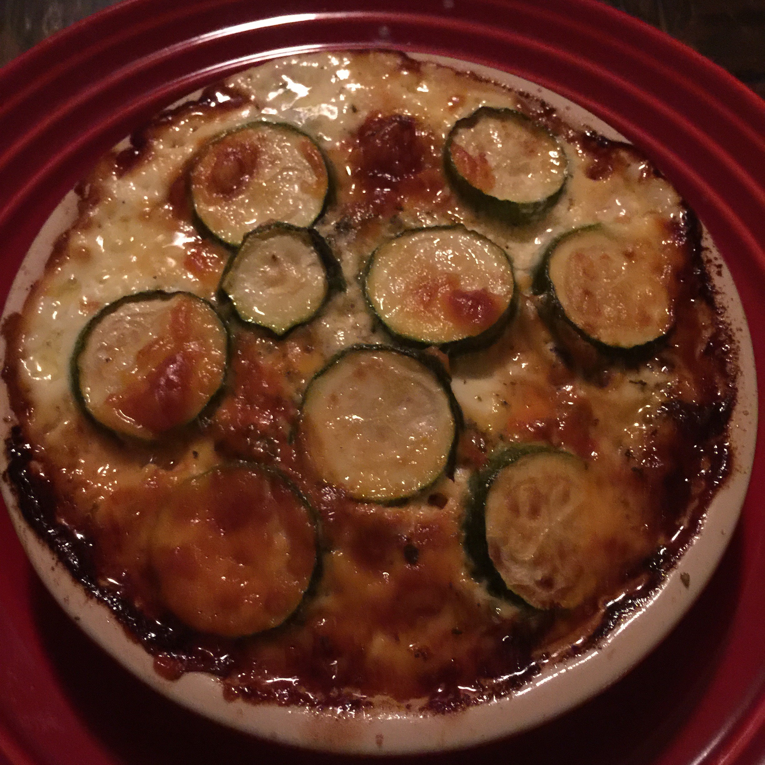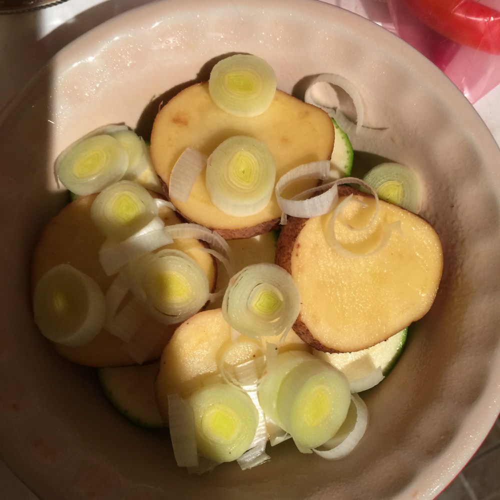 The mini casseroles are zucchini, German butterball, and leak topped with egg and cream and another layer of zucchini and 3yr aged cheddar ( the photo is mid build) with some penzeys Italian herbs…