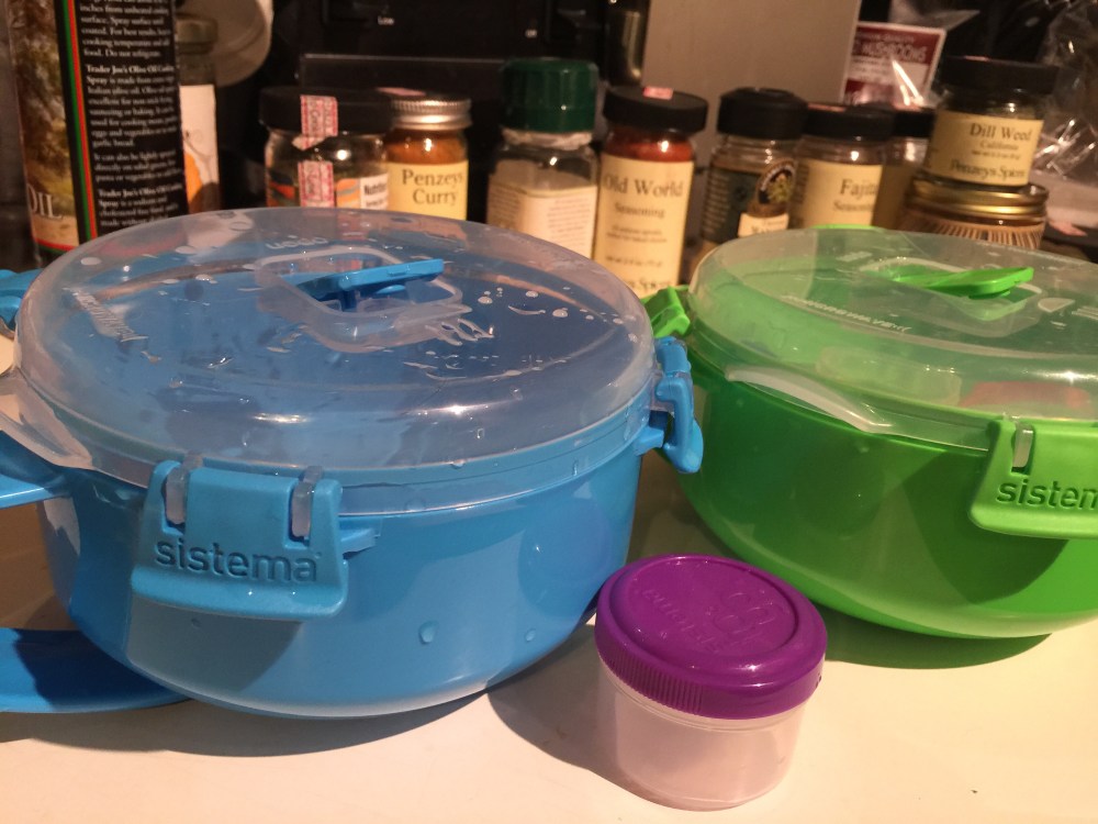 About a week after beginning to bring oatmeal for us for breakfast In our sistema microwave bowls, with the tiny condiment containers for honey and yogurt (I’ve fallen in love with trader joes low fat vanilla yogurt….it’s so yummy),  I made the plunge and added breakfast bowls and salad things