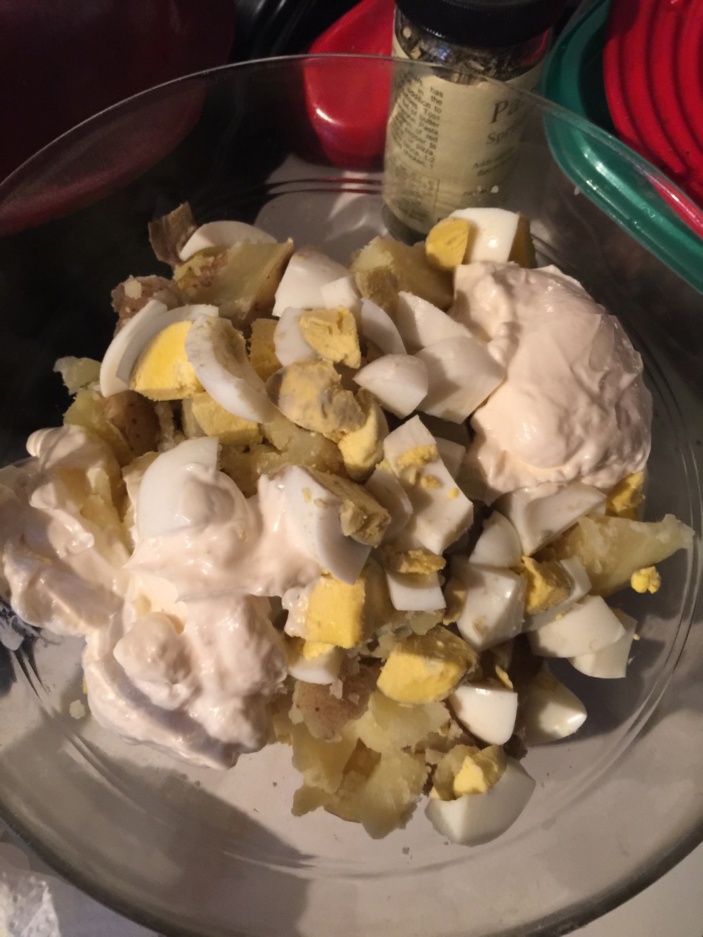 I bought some pretty pink and blue potatoes…these are colored clear through so they lose their color less than those with just a colored skin