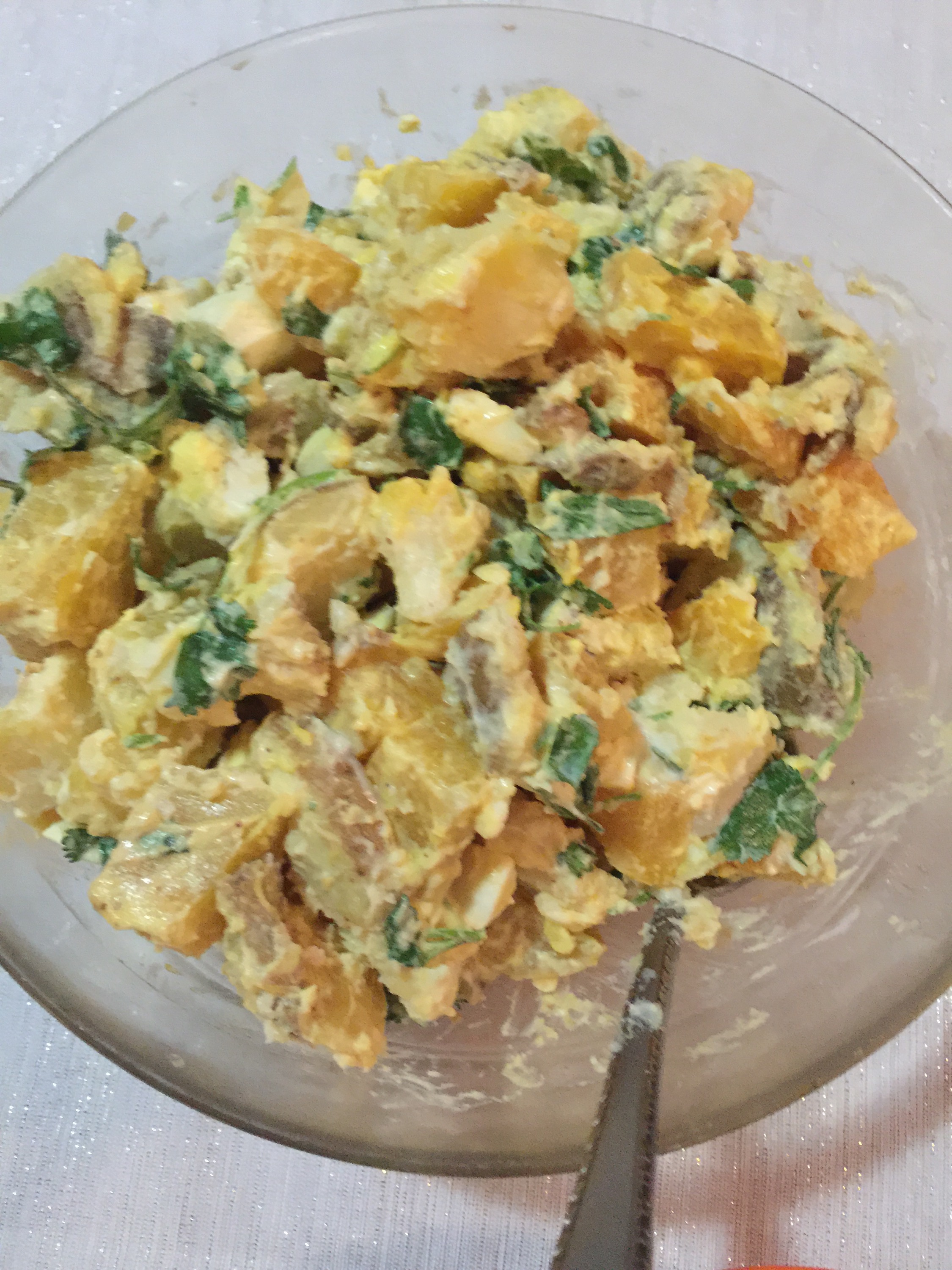 I bought some pretty pink and blue potatoes…these are colored clear through so they lose their color less than those with just a colored skin
