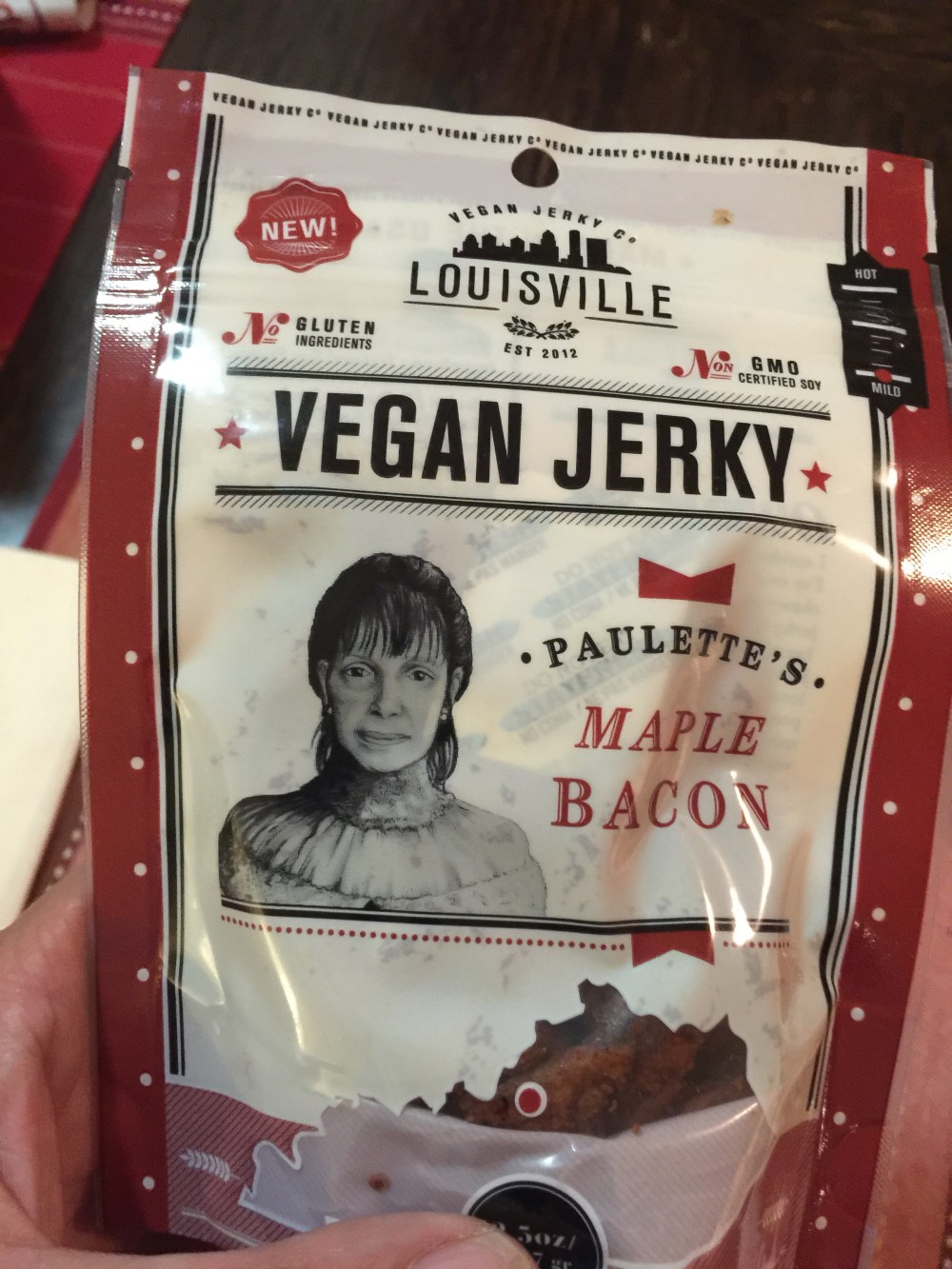 I havent even tried this yet…i ordered it online and then it showed up with the picture which immediately made me think of how unhappy she looks to be eating vegan jerky…i said it must be named after his mother or grandmother or something…nope.  The back just has a message from the owner about how he started making it with no mention of Paulette.