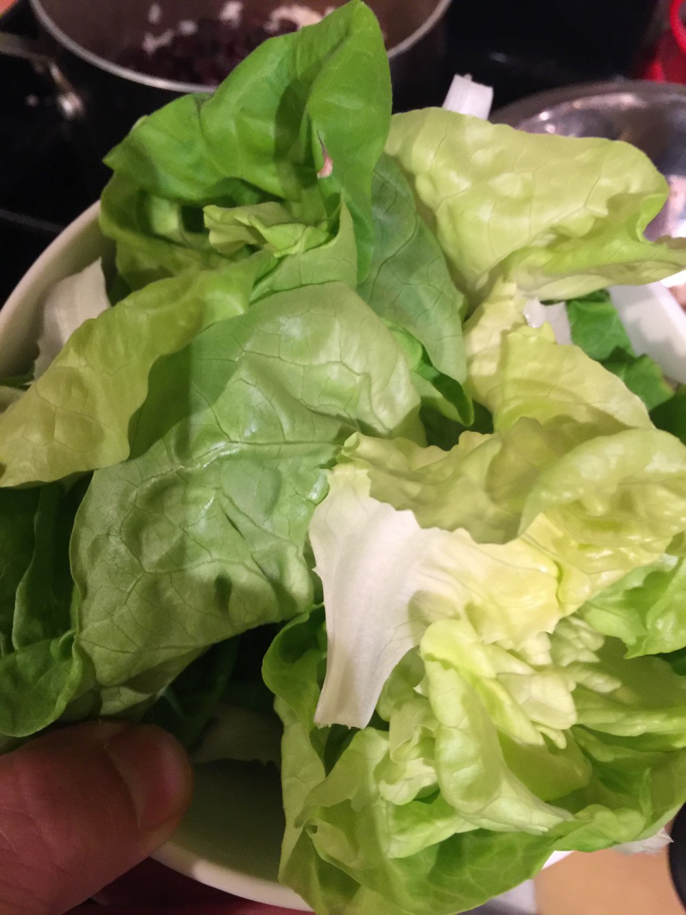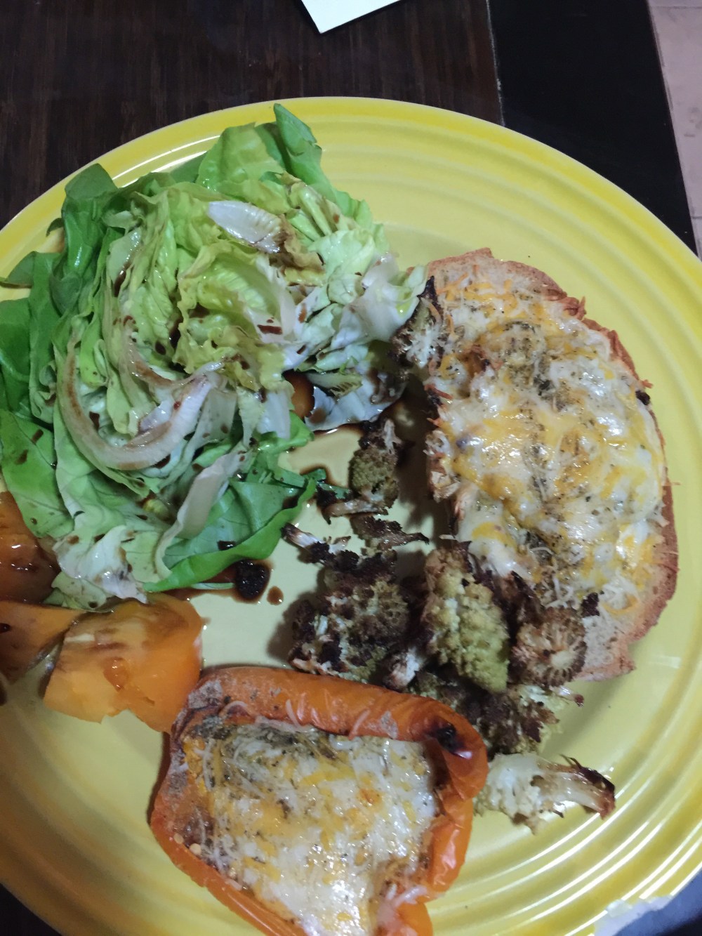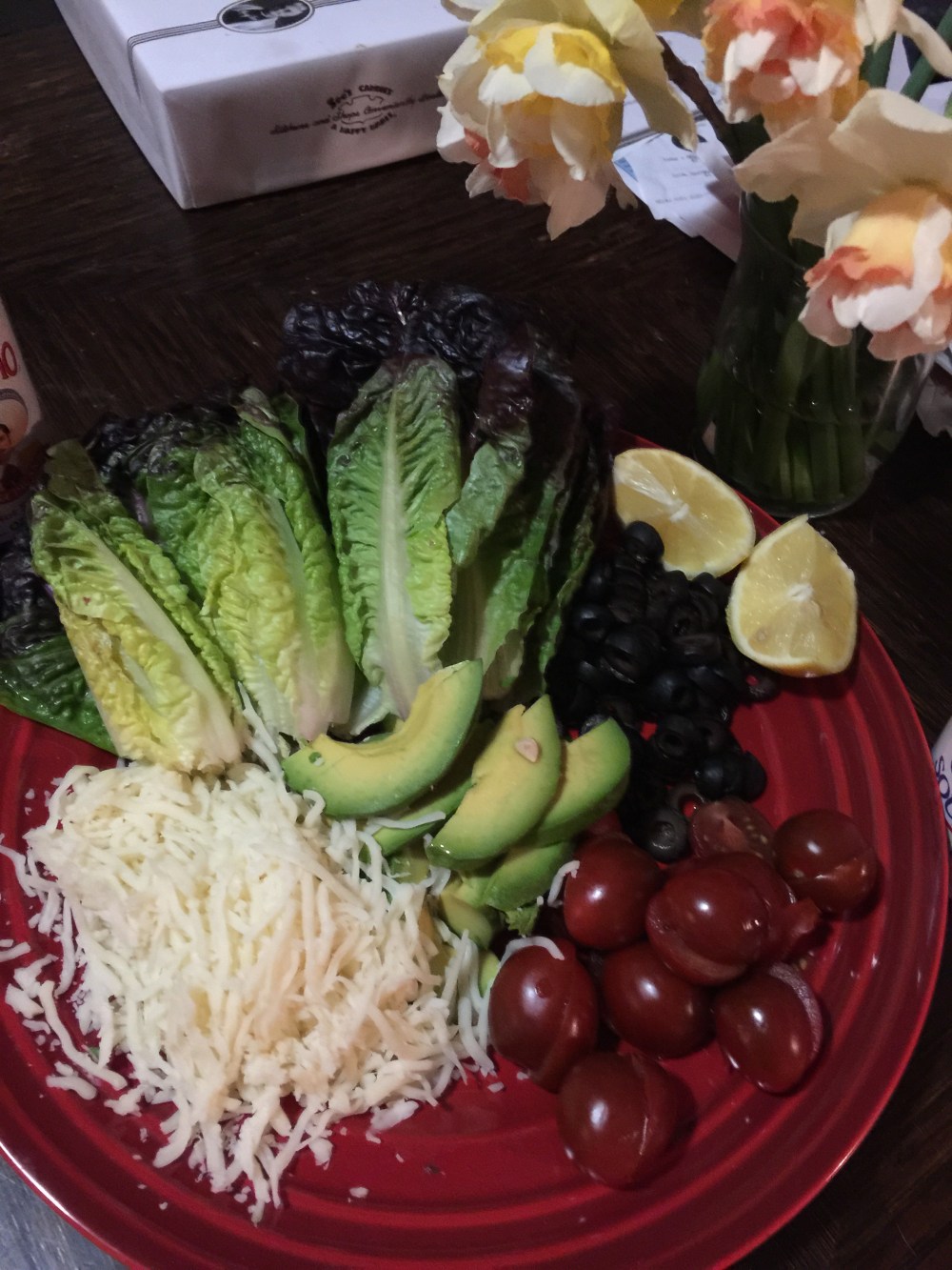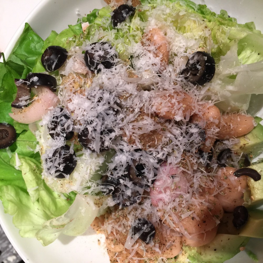 Beans, green lettuce, avocado, tomato, brie chunks, a few pepperonxini…some penzeys greek and tuscan blends with olive oil and tarragon white balsamic