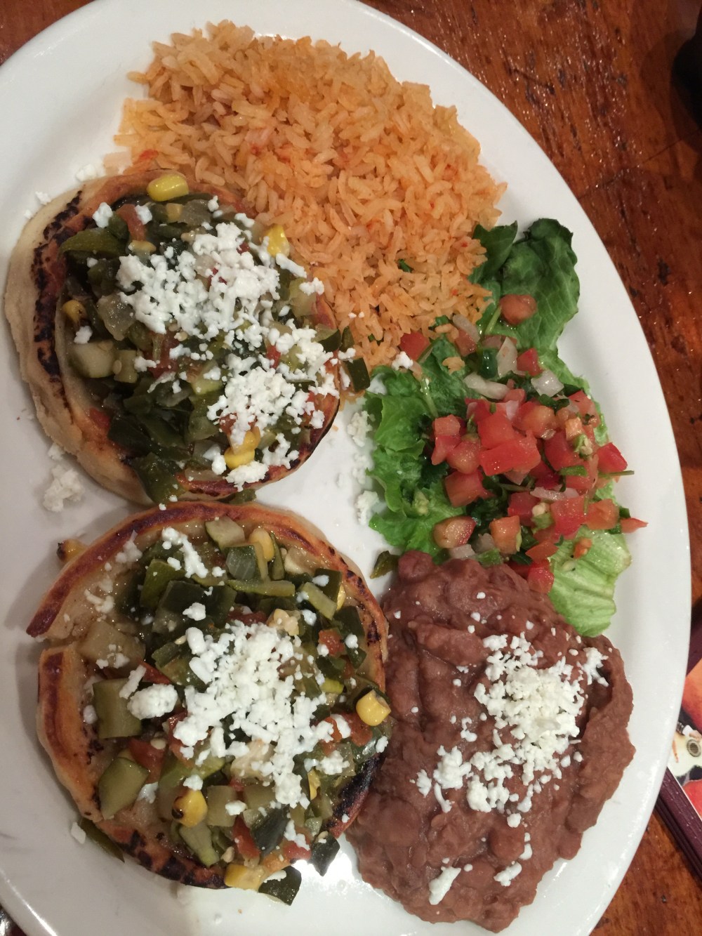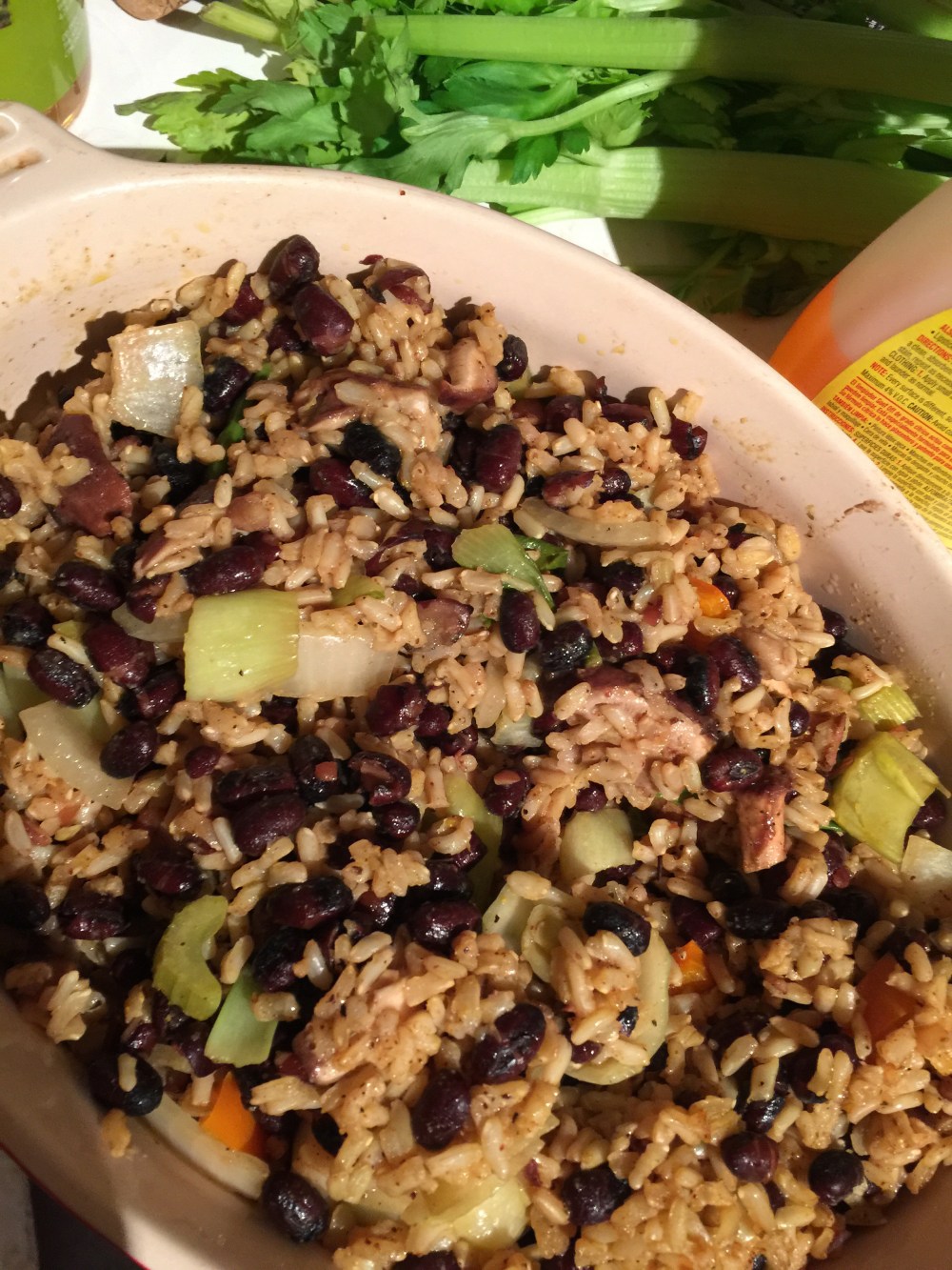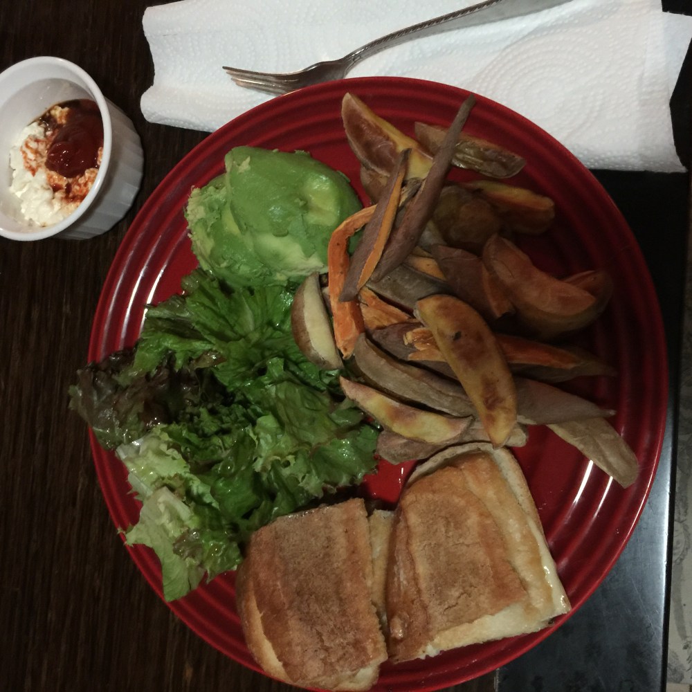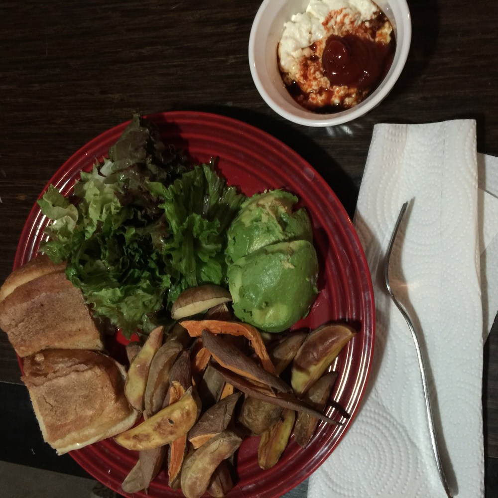 Beans, green lettuce, avocado, tomato, brie chunks, a few pepperonxini…some penzeys greek and tuscan blends with olive oil and tarragon white balsamic