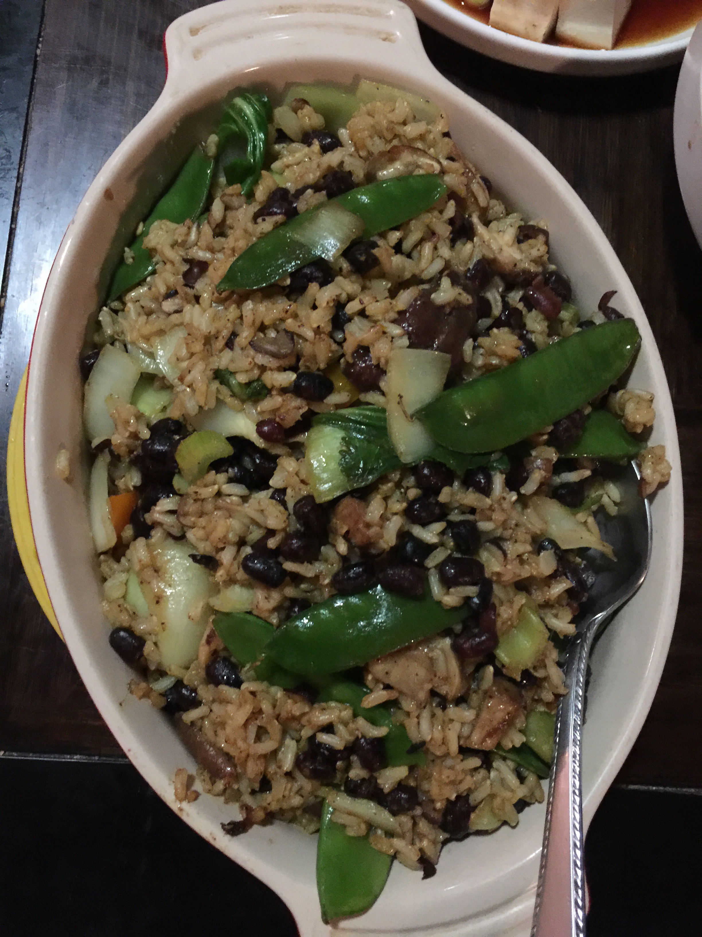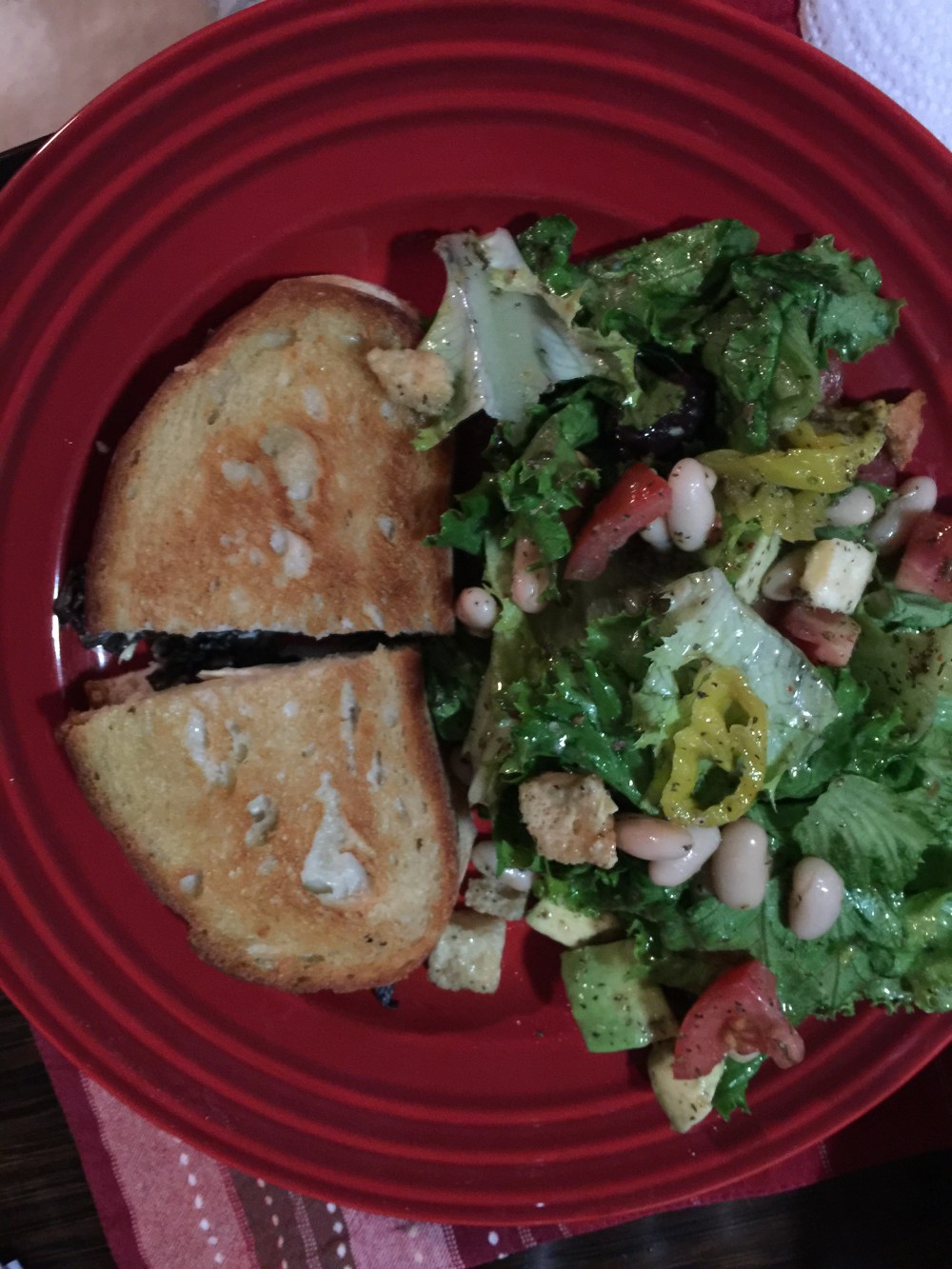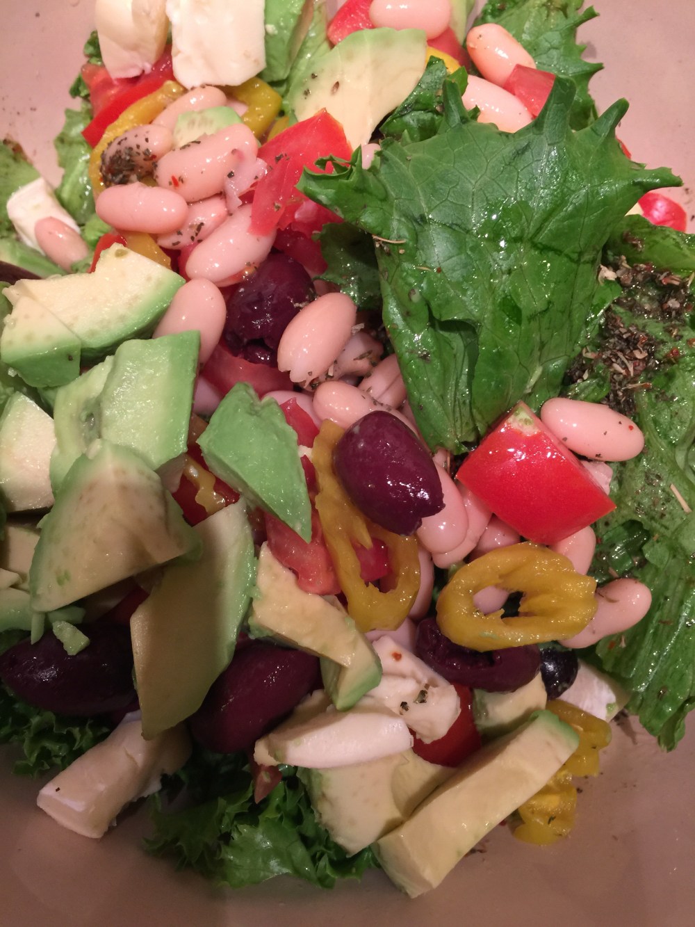 Beans, green lettuce, avocado, tomato, brie chunks, a few pepperonxini…some penzeys greek and tuscan blends with olive oil and tarragon white balsamic