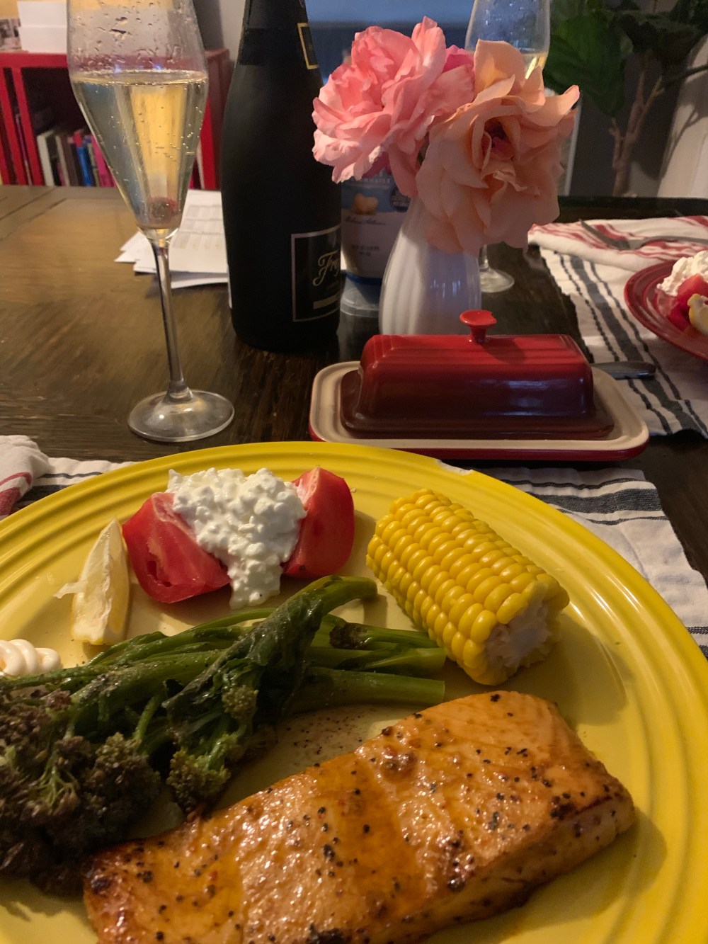 And corn, marinated salmon and some tomato and cottage cheese. Pretty light–and i have gained the covid 5 so im trying to tone it back.