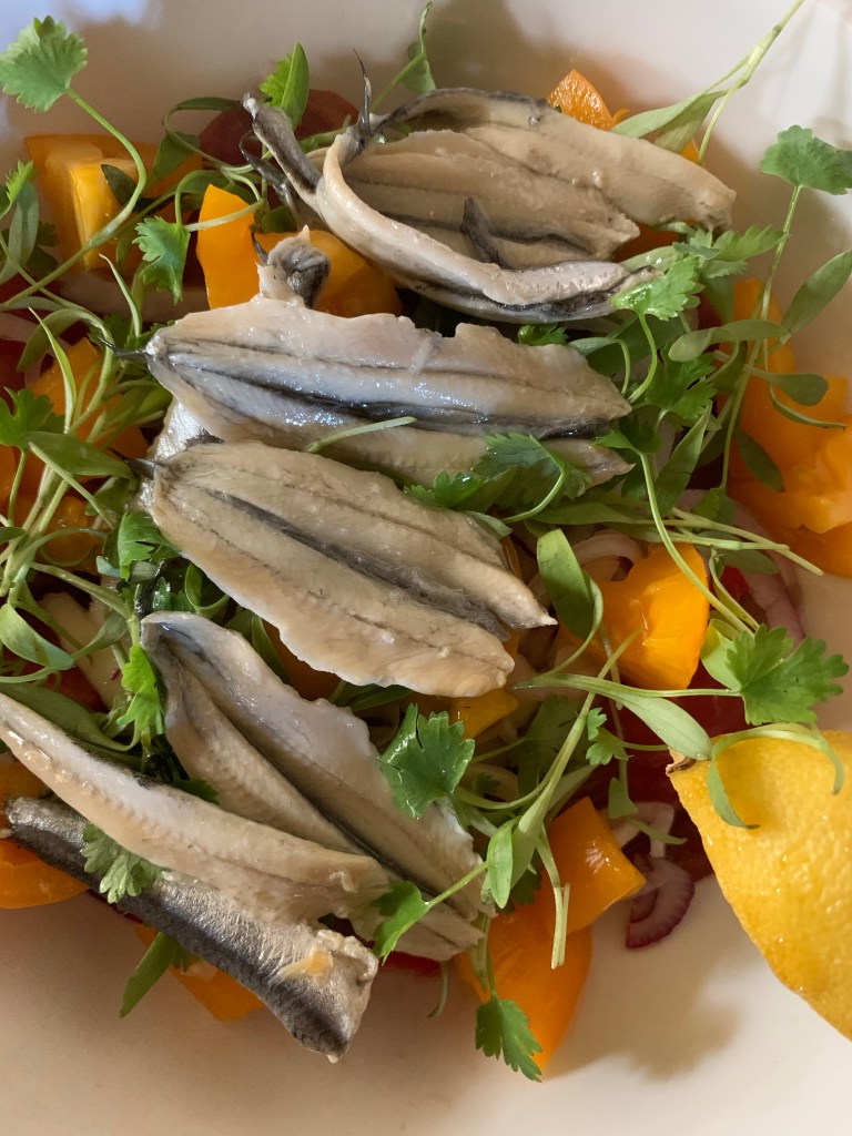 Tonights salad is tomato, micro cilantro, onions, shallot, and white anchovies…with sherry vinegar