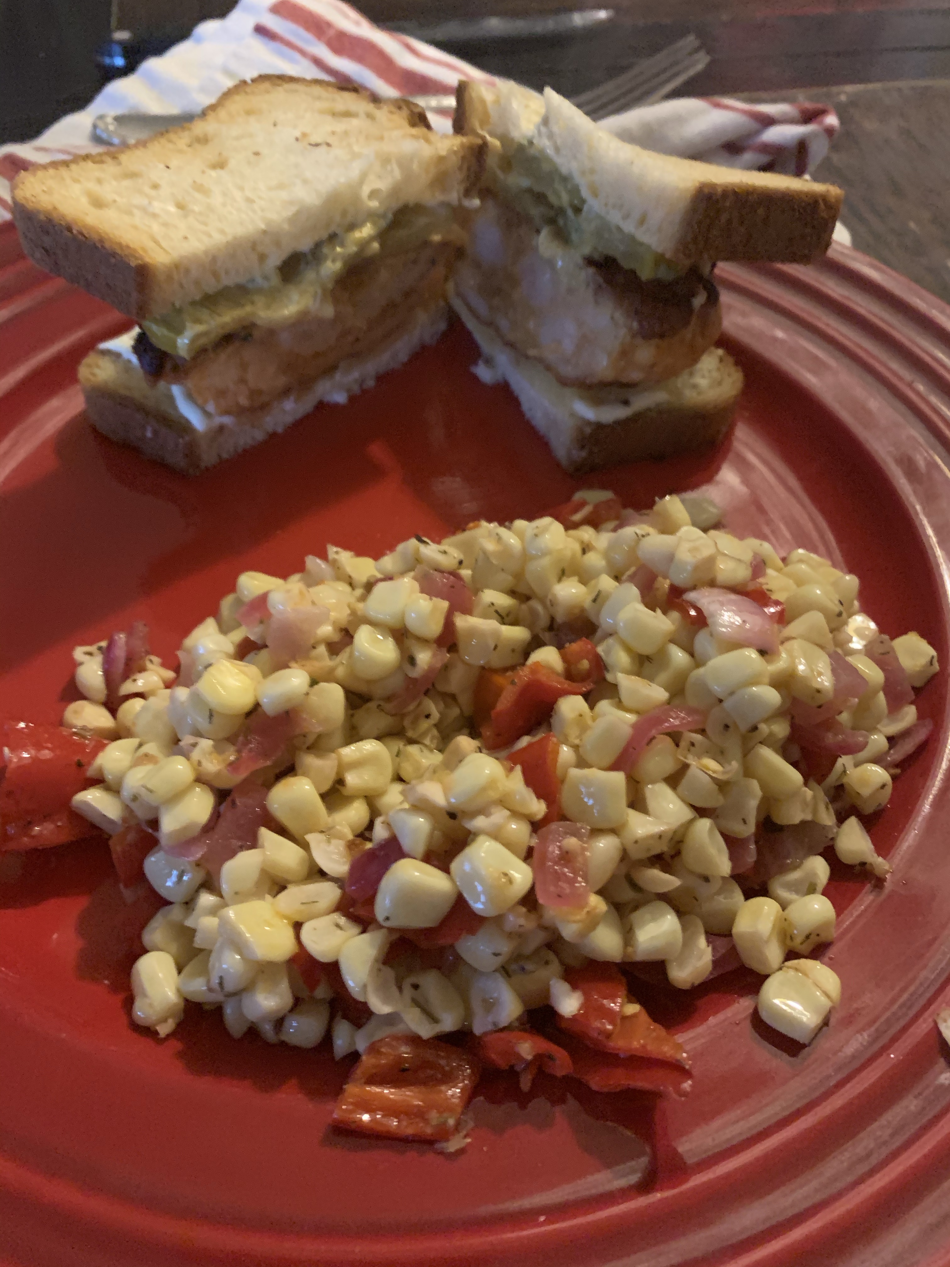 Had a shrimp burger and a corn/pepper salad..