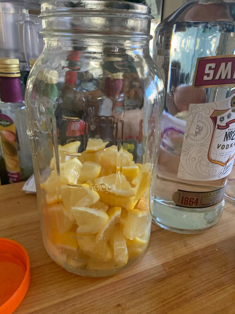 Then I poured in 1/2 the vodka and shook to dissolve. Then the rest of the vodka. This jar held 1/2 the bottle with the lemon bulk in it.