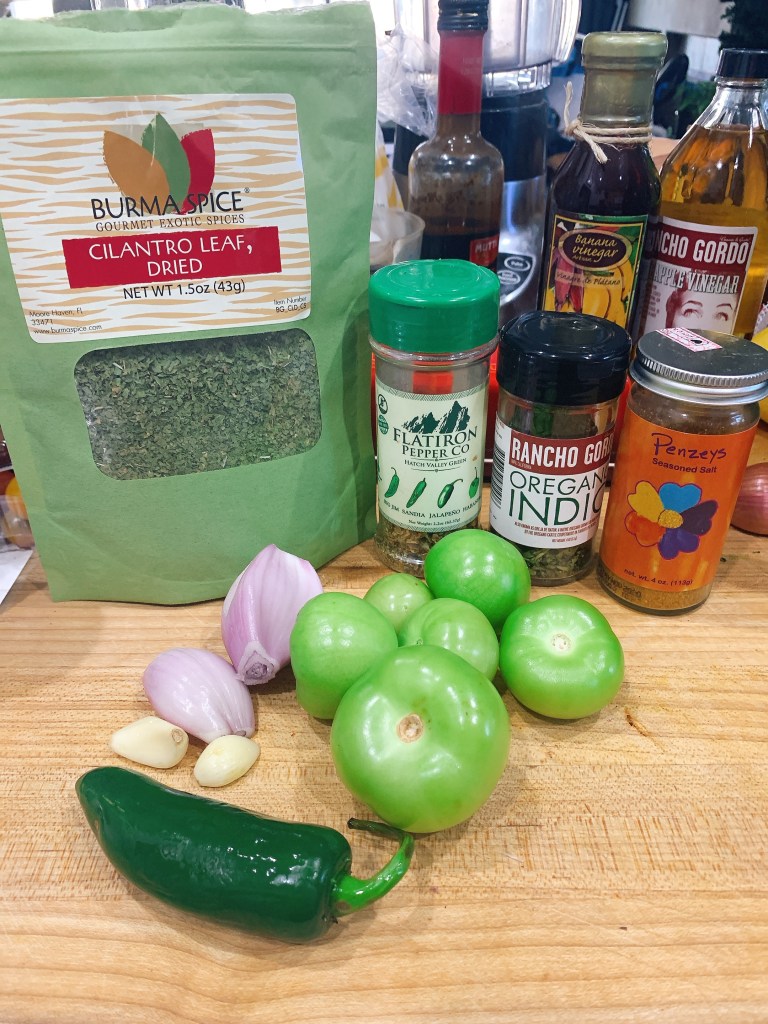For the green salsa…I toasted the ingredients below and gave them a whir and now they simmer a bit.
