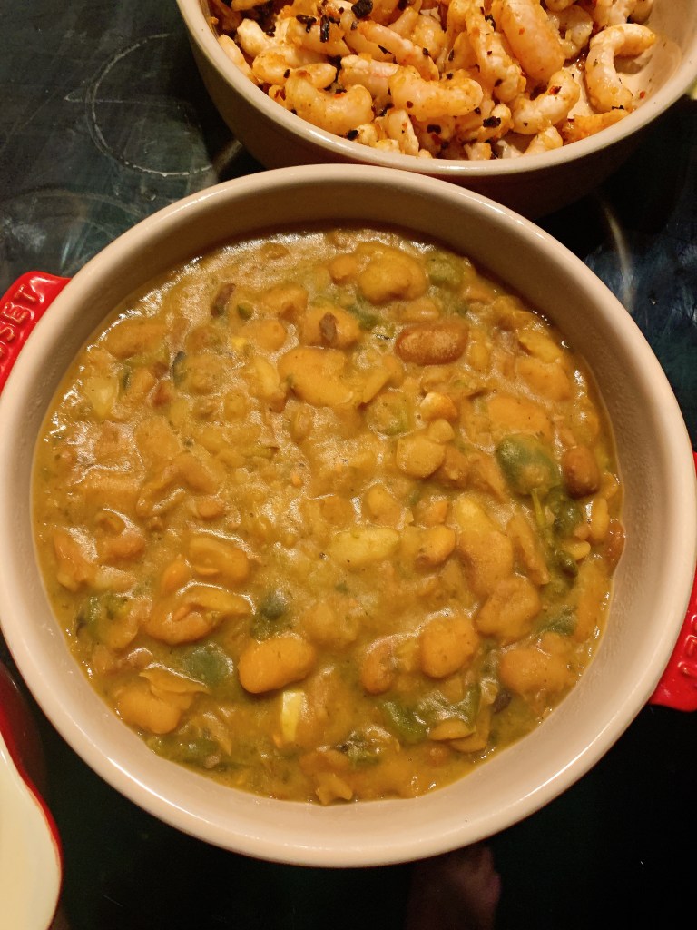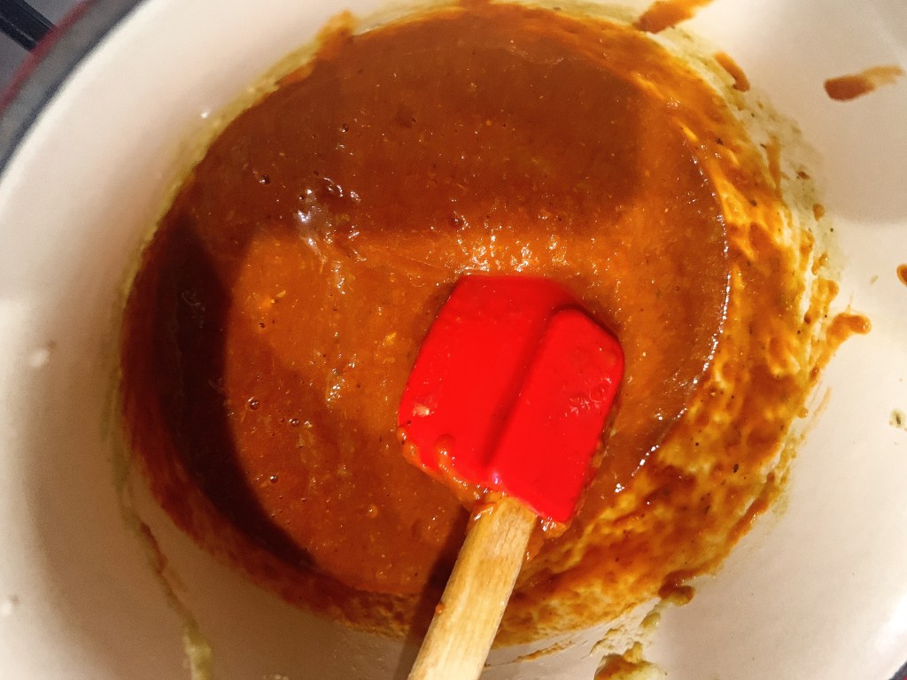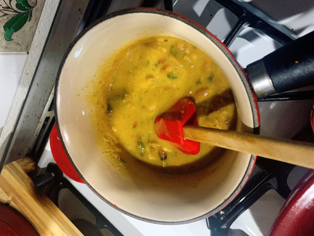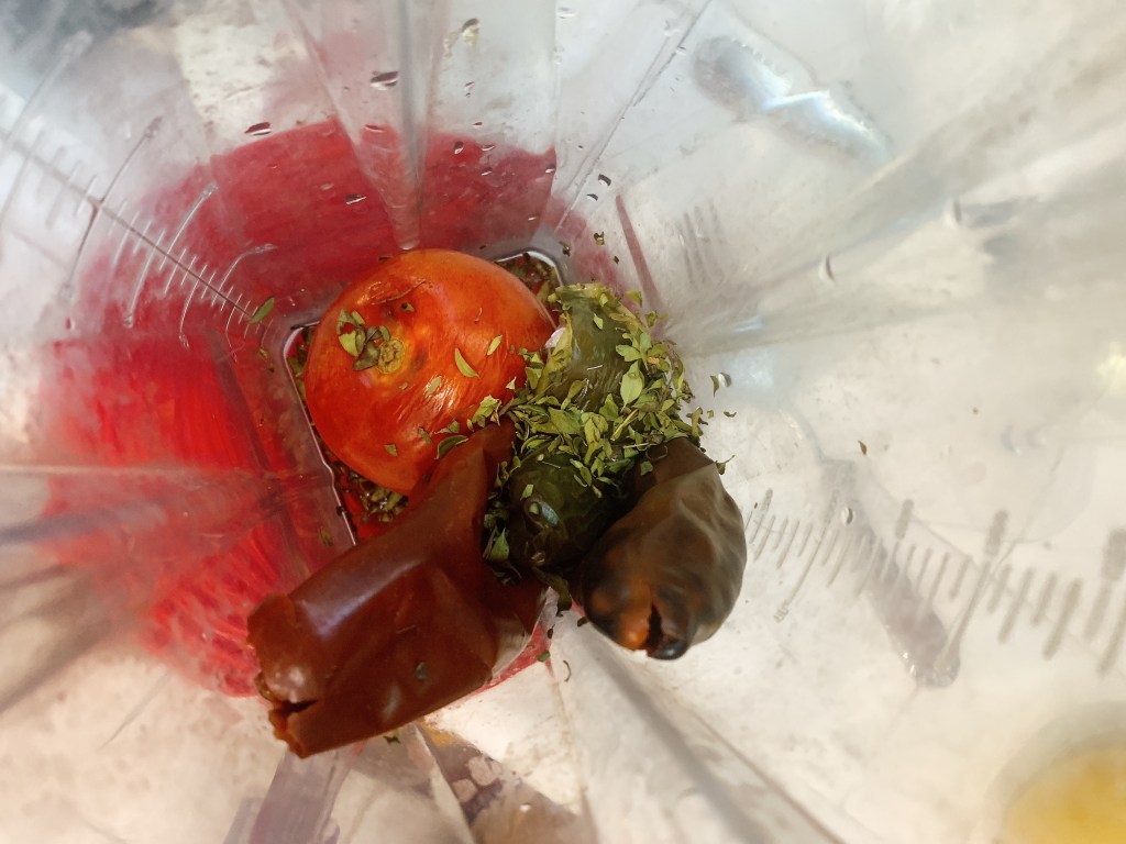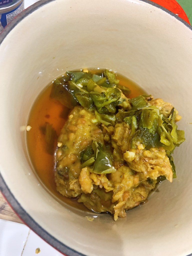 The beans are leftover “refried” pintos from another post. I added roasted jalapeño and some Chile soaking liquid to simmer and blend.