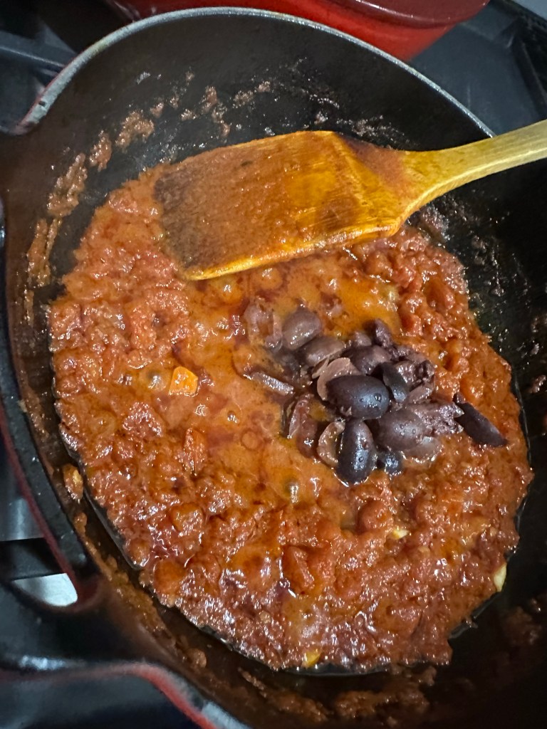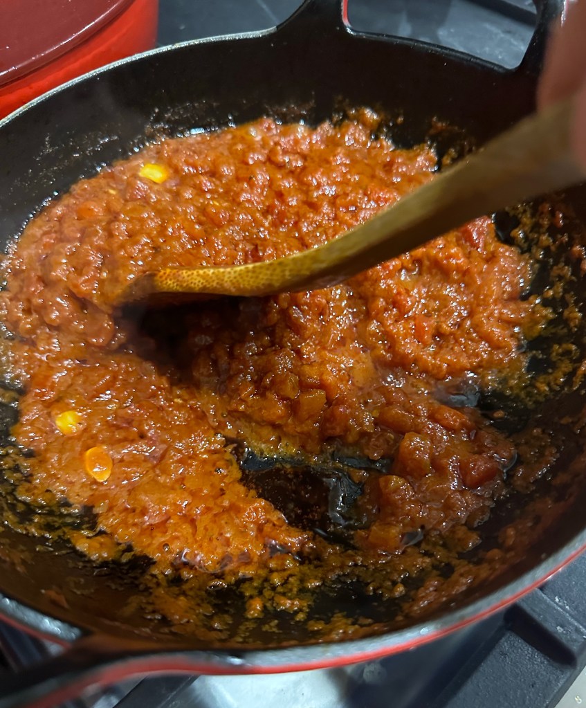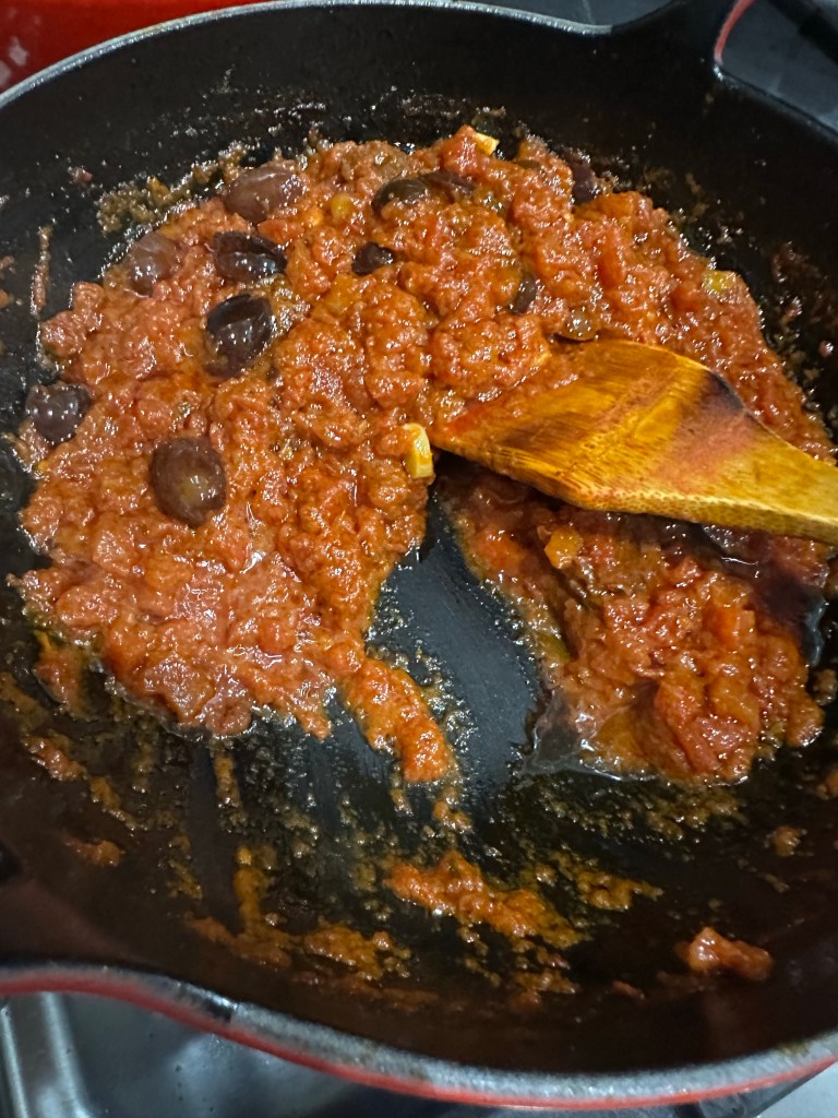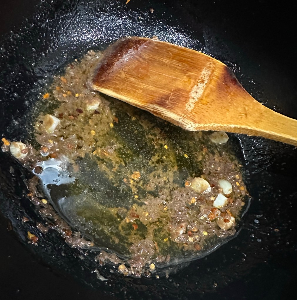 Korean red pepper flakes (just a dash), some seasoned soy paste (1/2 tsp), and about 1TBl kimchi. Mix it all up.