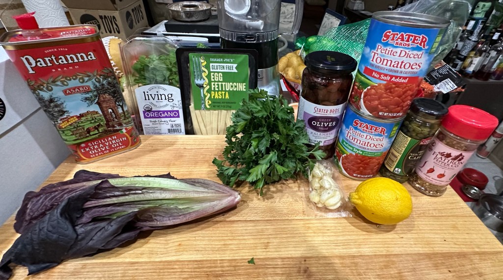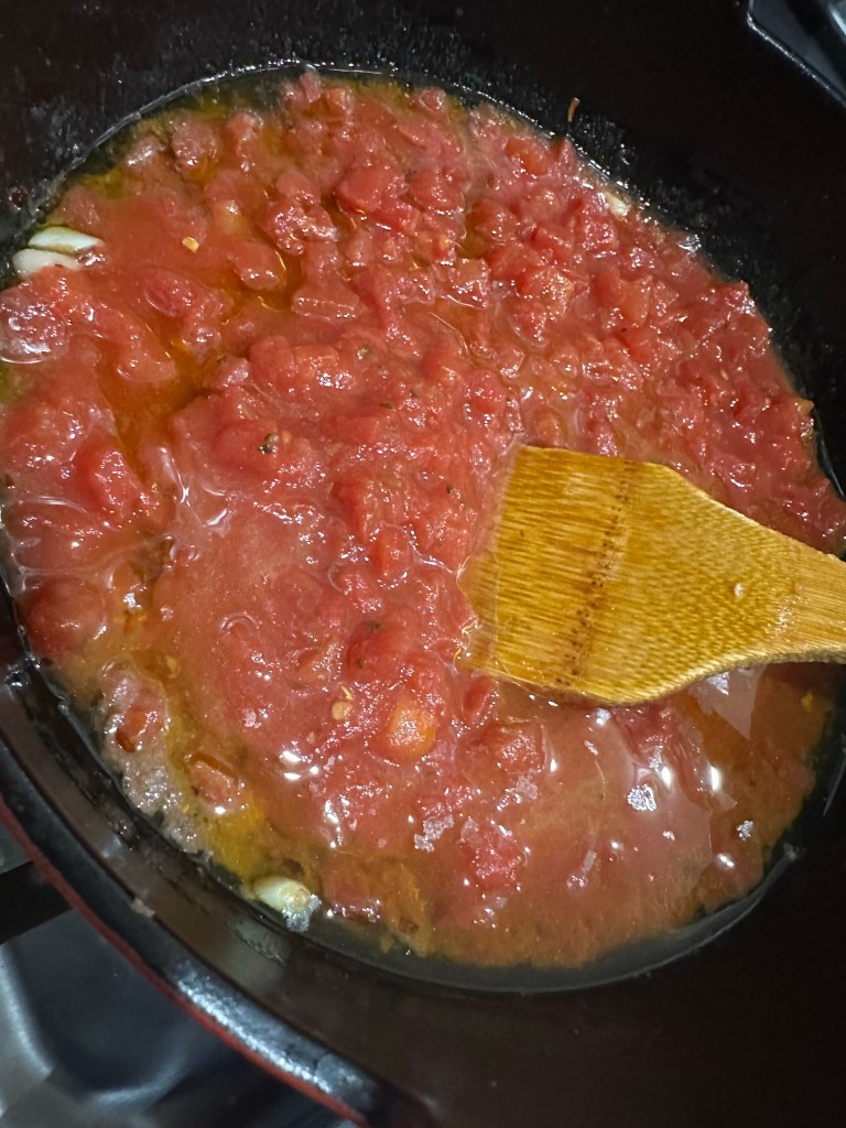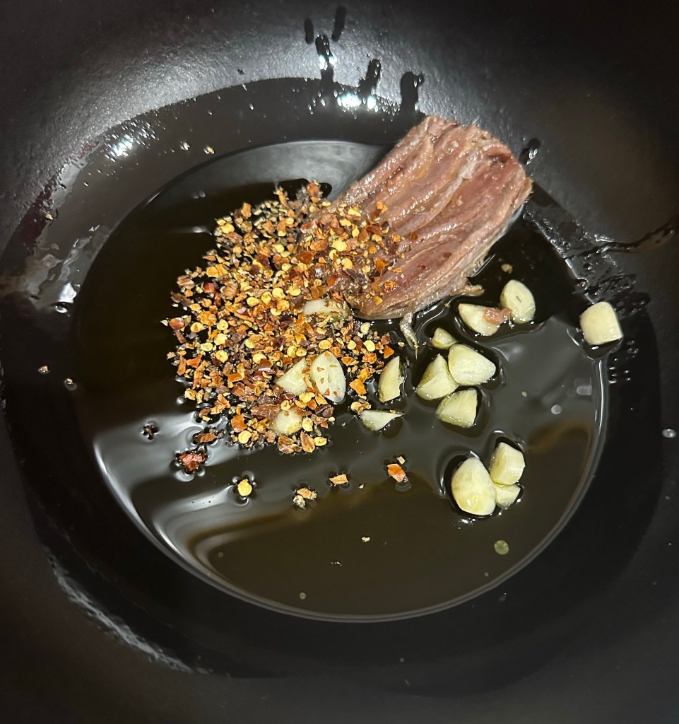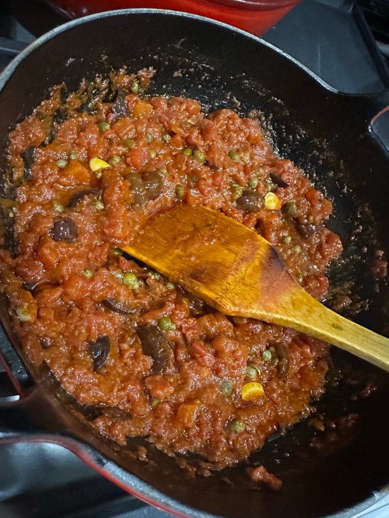 Korean red pepper flakes (just a dash), some seasoned soy paste (1/2 tsp), and about 1TBl kimchi. Mix it all up.