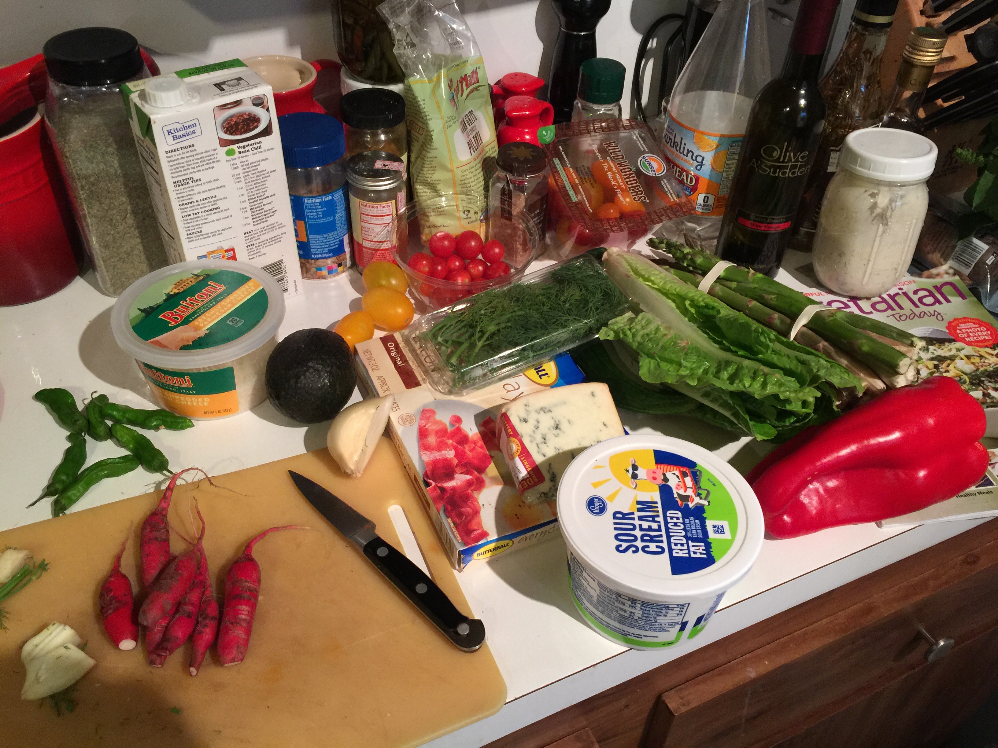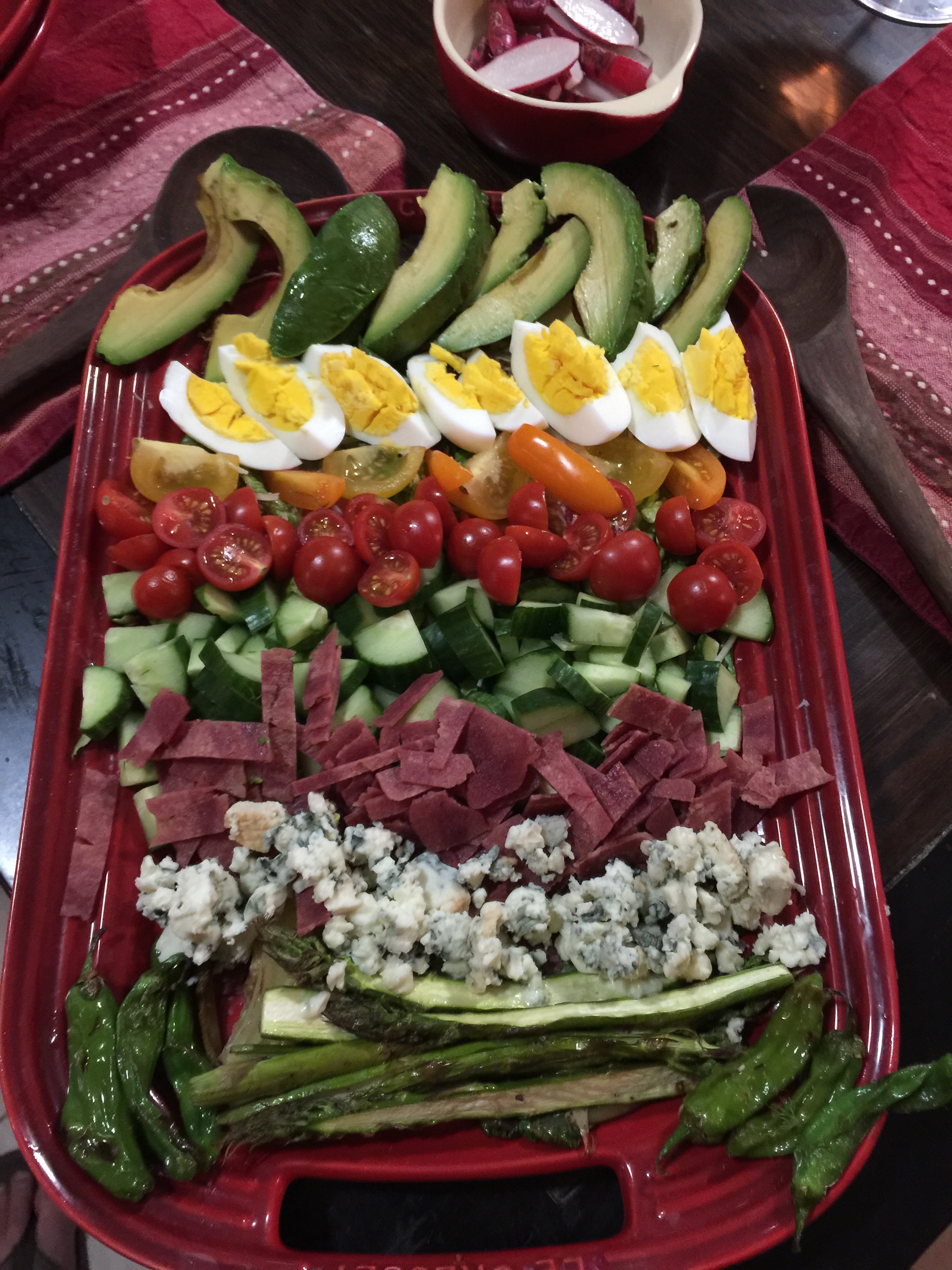 Here is my mise en place for this email inspired idea…romaine, parmesan, homemade dressing, smoked blue cheese, tomato, avocado, bacon, garlic, radish, shishito (that i grew!), cucumber….i took like 4 pictures because this has the red pepper that i removed but didnt have the egg i added, etc