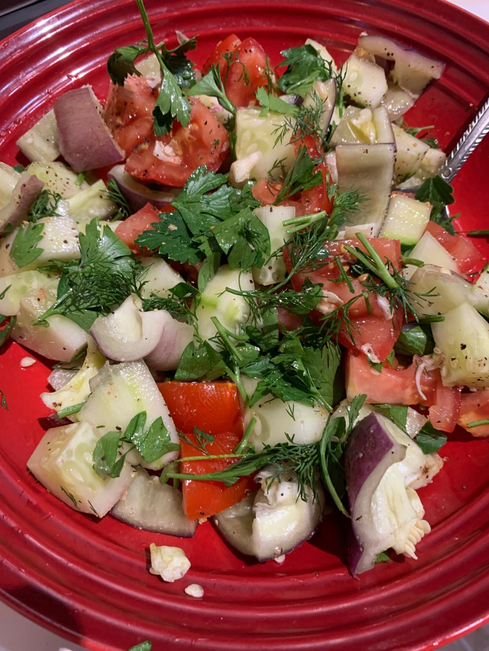 I made a quick salad of purple pepper, tomato and cucumber with evoo and sherry vinegar with penzeys florida pepper…