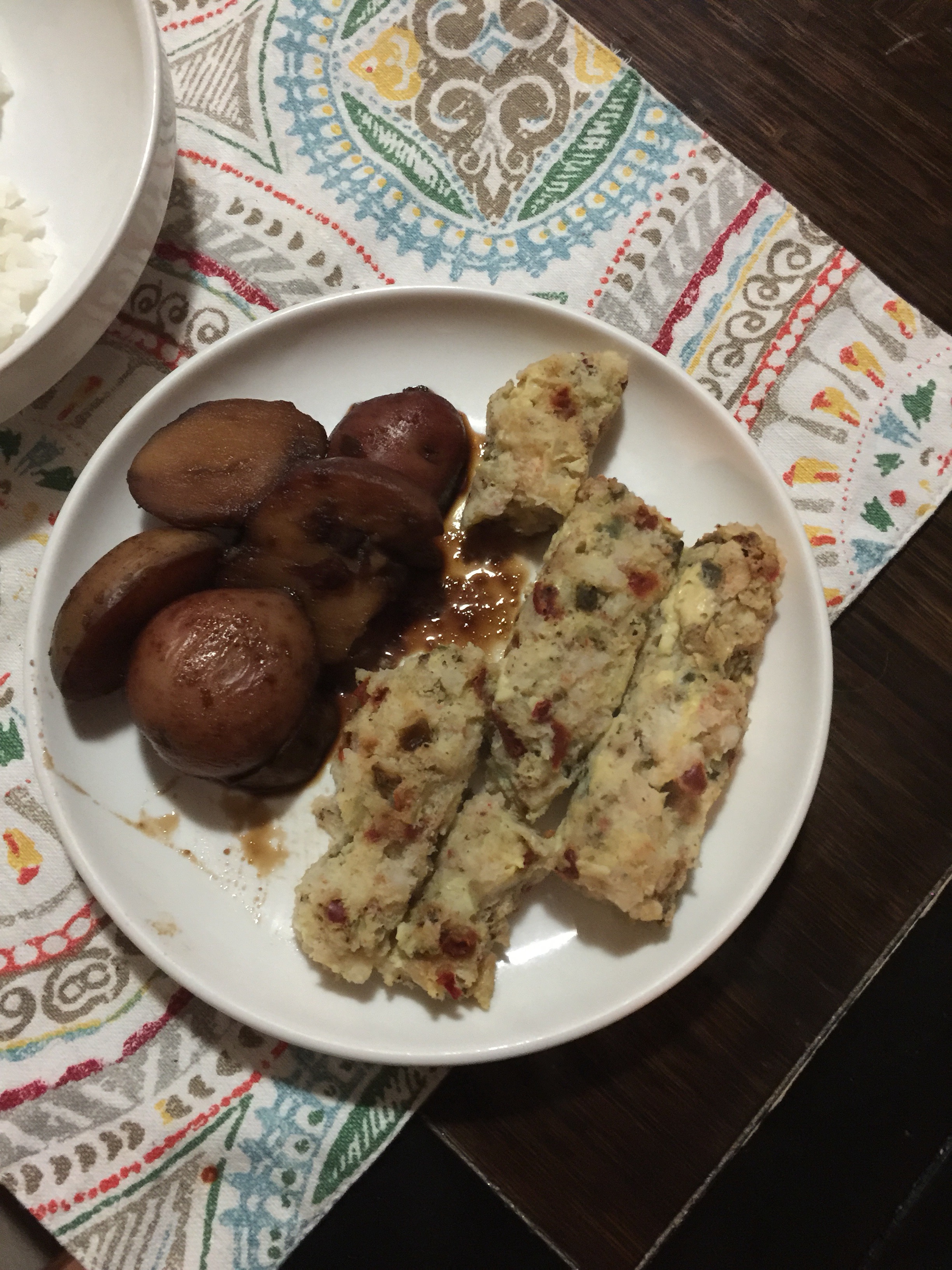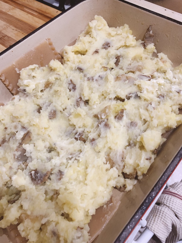 For my bottom layer I used mashed potatoes—mine were made from scratch with a little butter and some sour cream, but you can use your favorite recipe or even instant. I made about 1/2 layer.