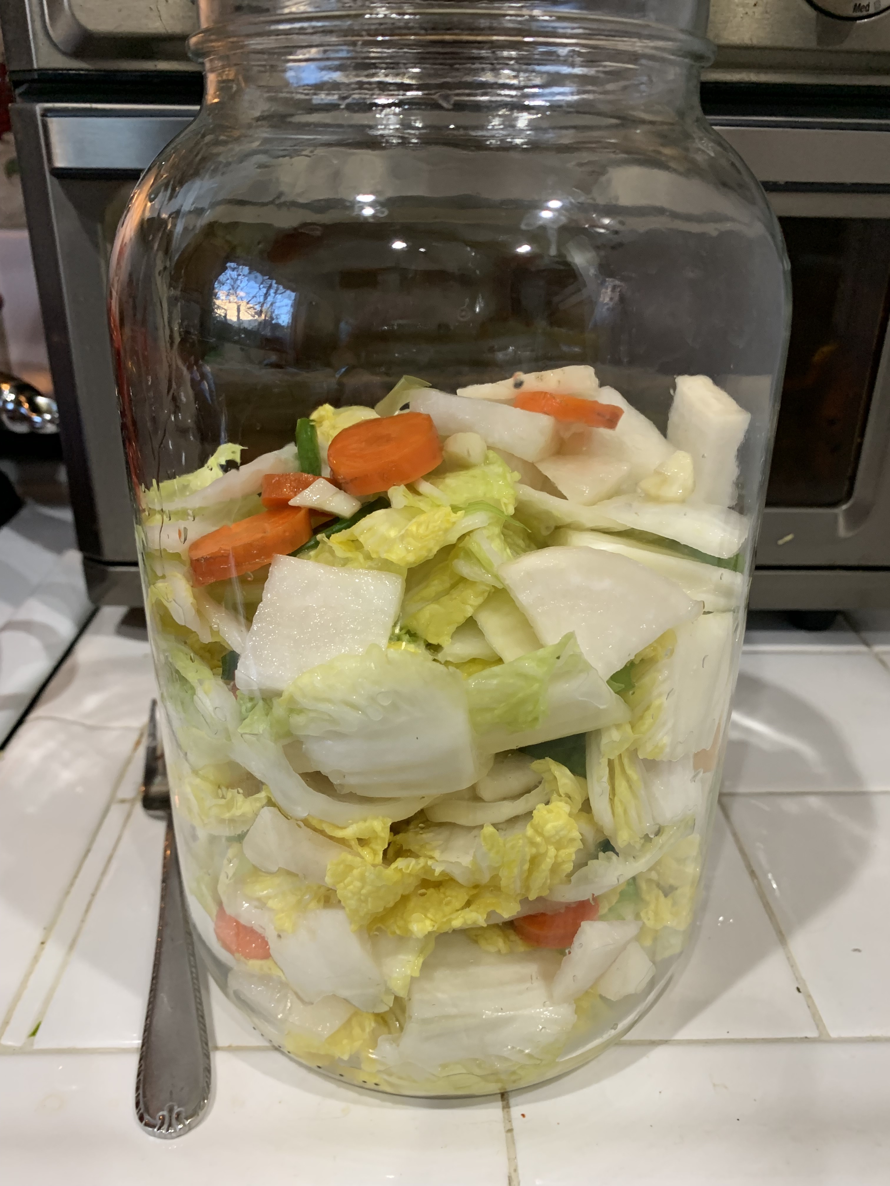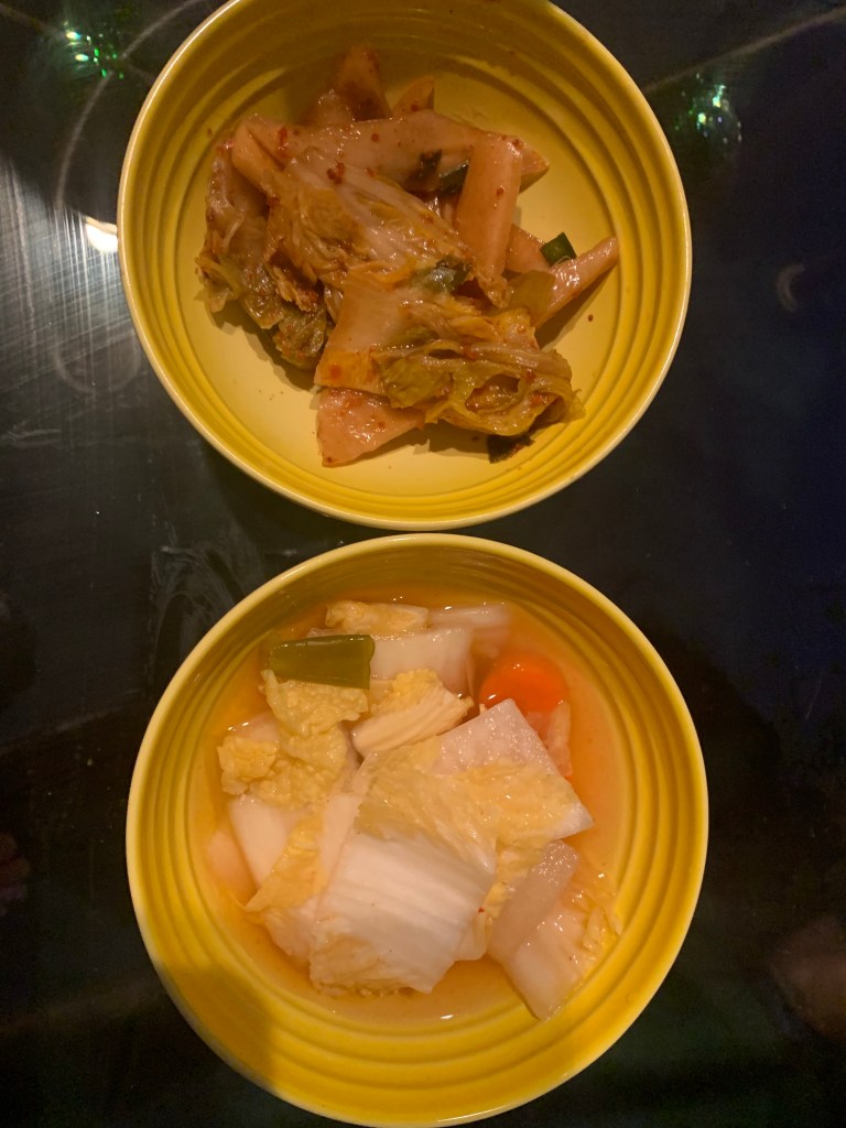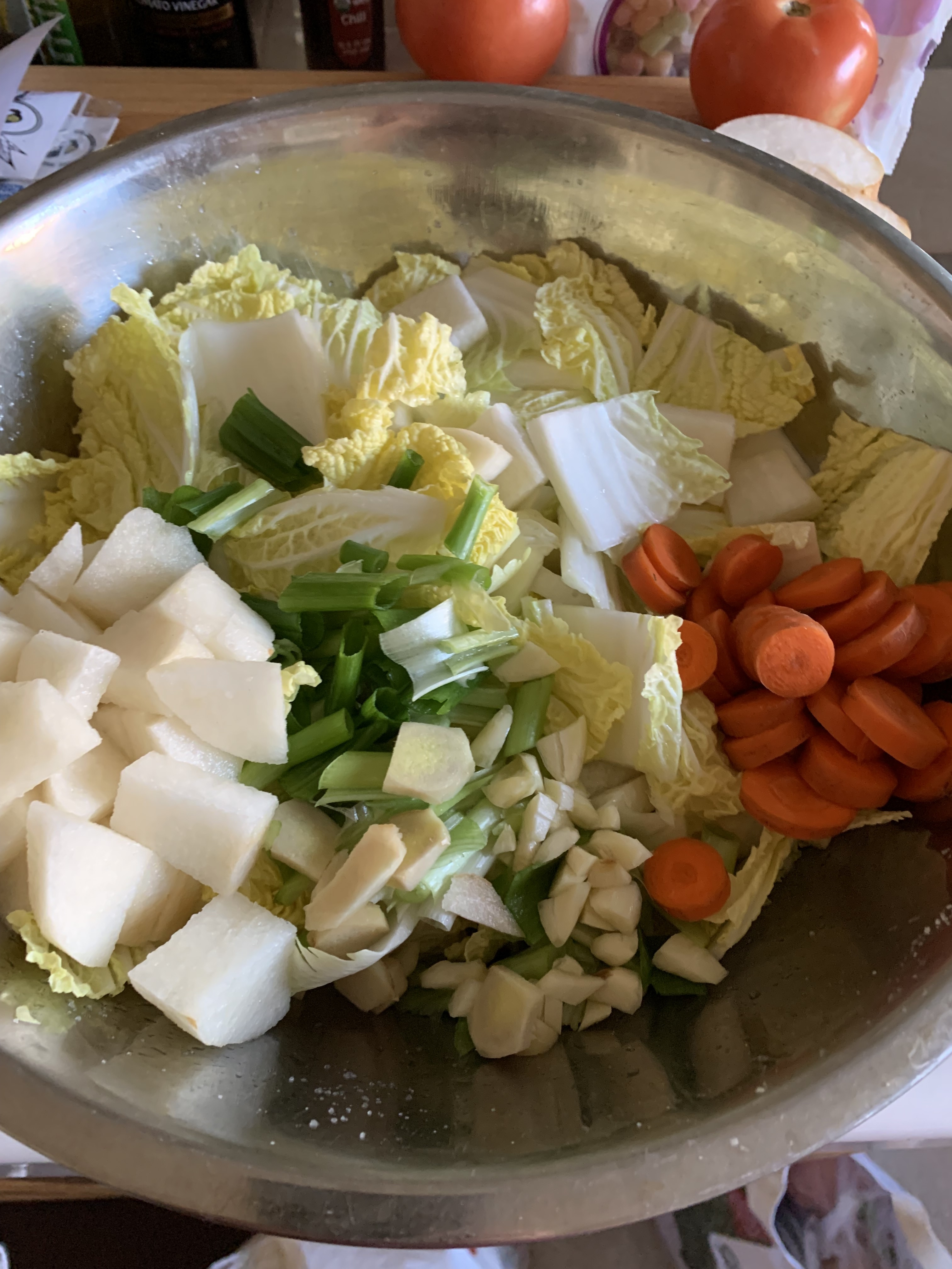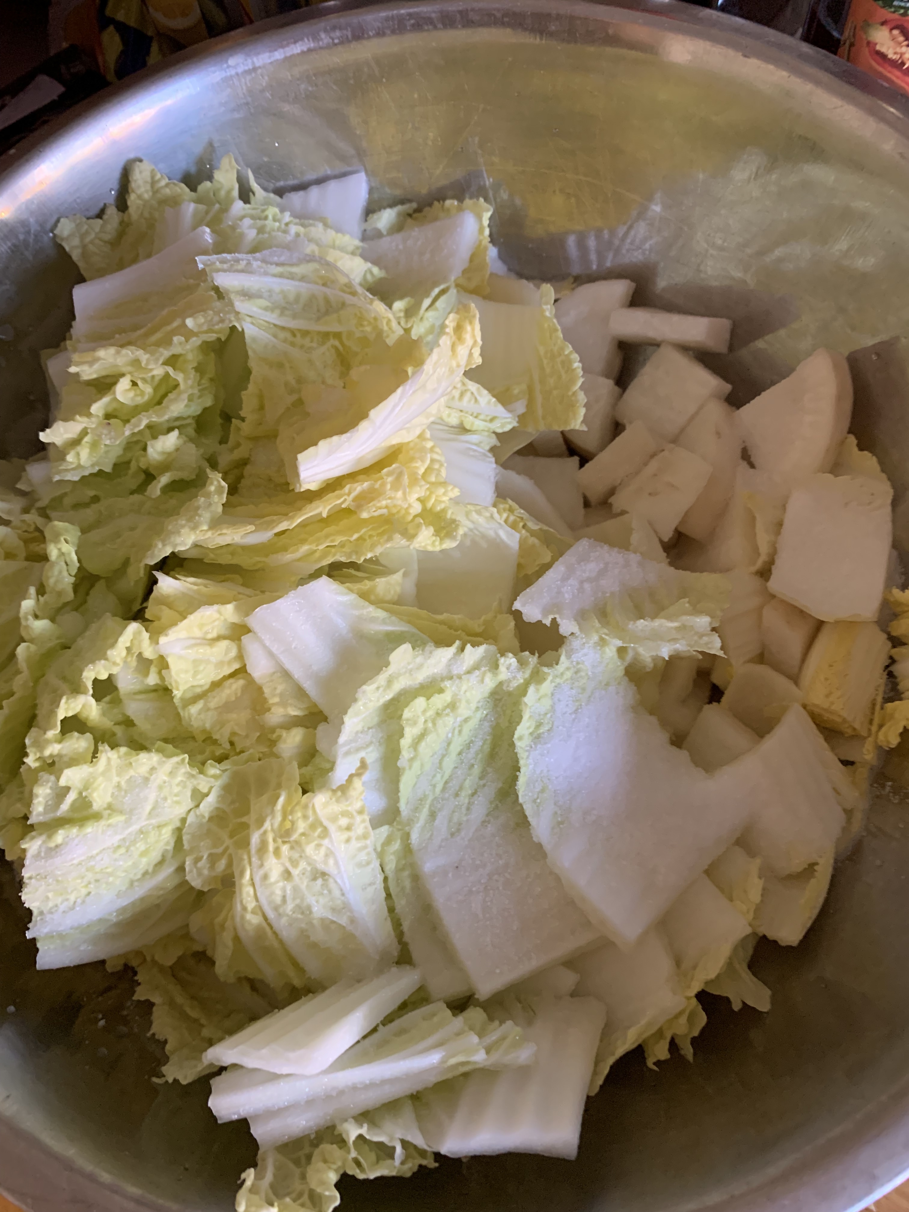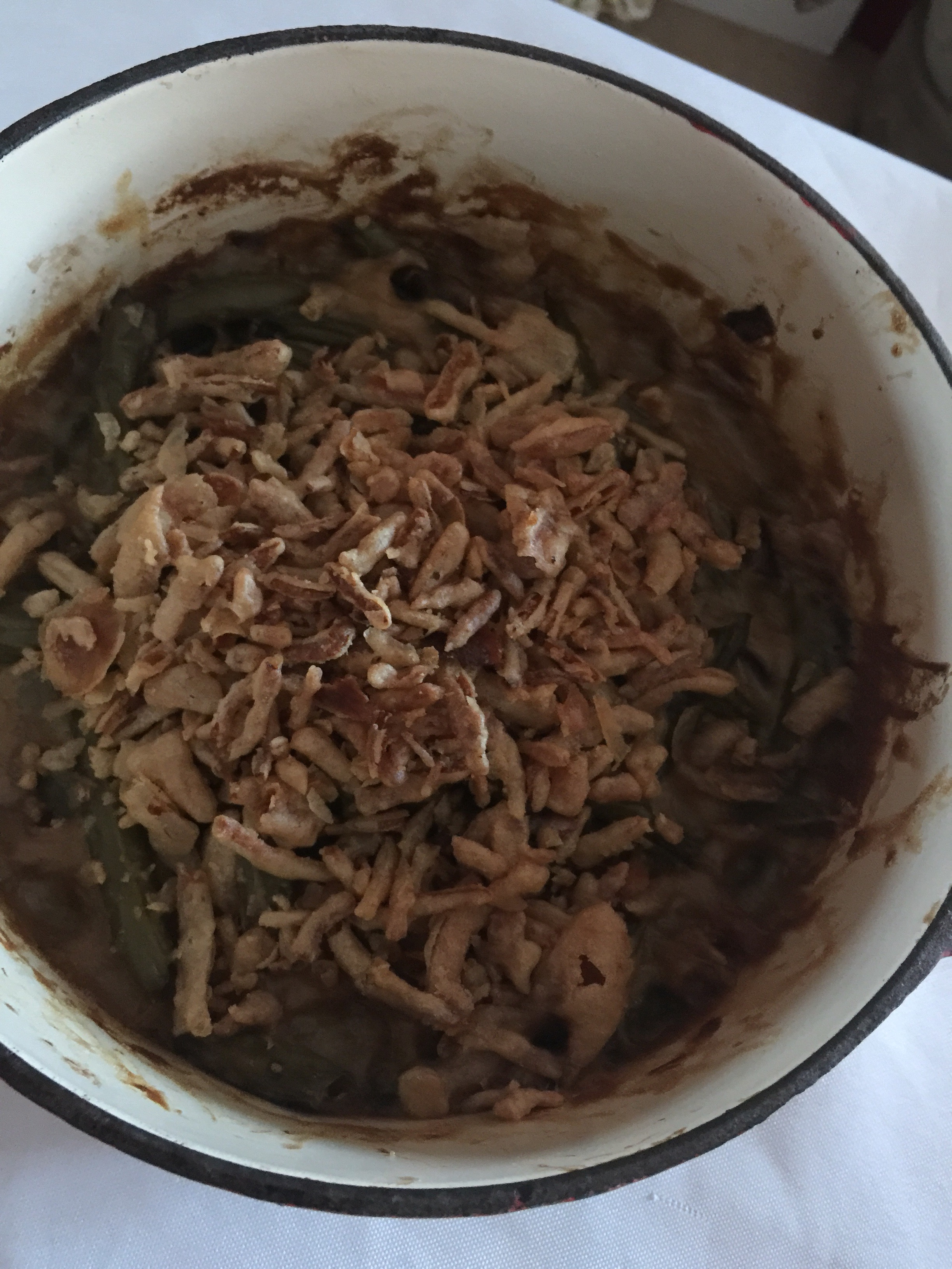 I then added a layer of sauerkraut and mu herons. This was a fresh caraway kraut but you can use your favorite and vary amount to your liking. This was about 8 ounces. You don’t need to drain it perfectly because a little liquid in this dish is okay. i used a small can of sliced mushrooms and scattered those drained mushrooms on the sauerkraut.