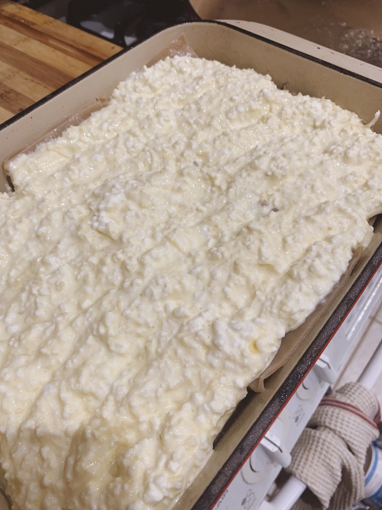 The next layer was cottage cheese, egg and Parmesan. I mixed 16 ounces of full fat cottage cheese, 1 egg, 1/2 cup parmesan.