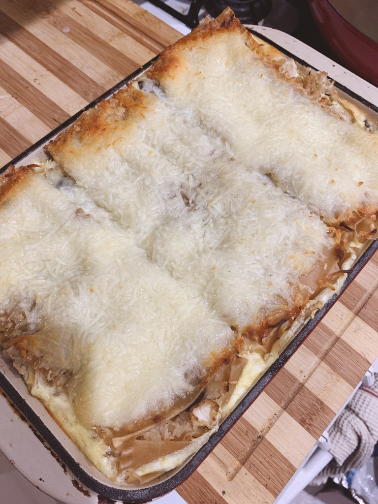 First you need to boil your noodles—I used jovial gluten free noodles. i used the whole package of 12 as I was making 4 layers. I placed three as the bottom layer on a greased pan.