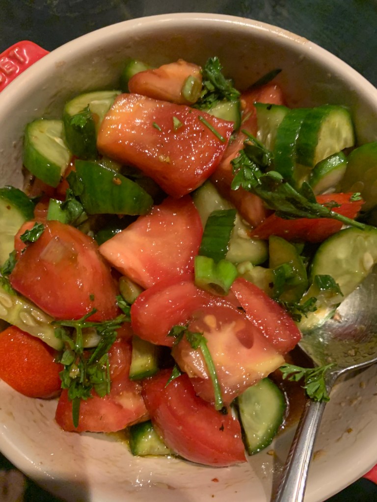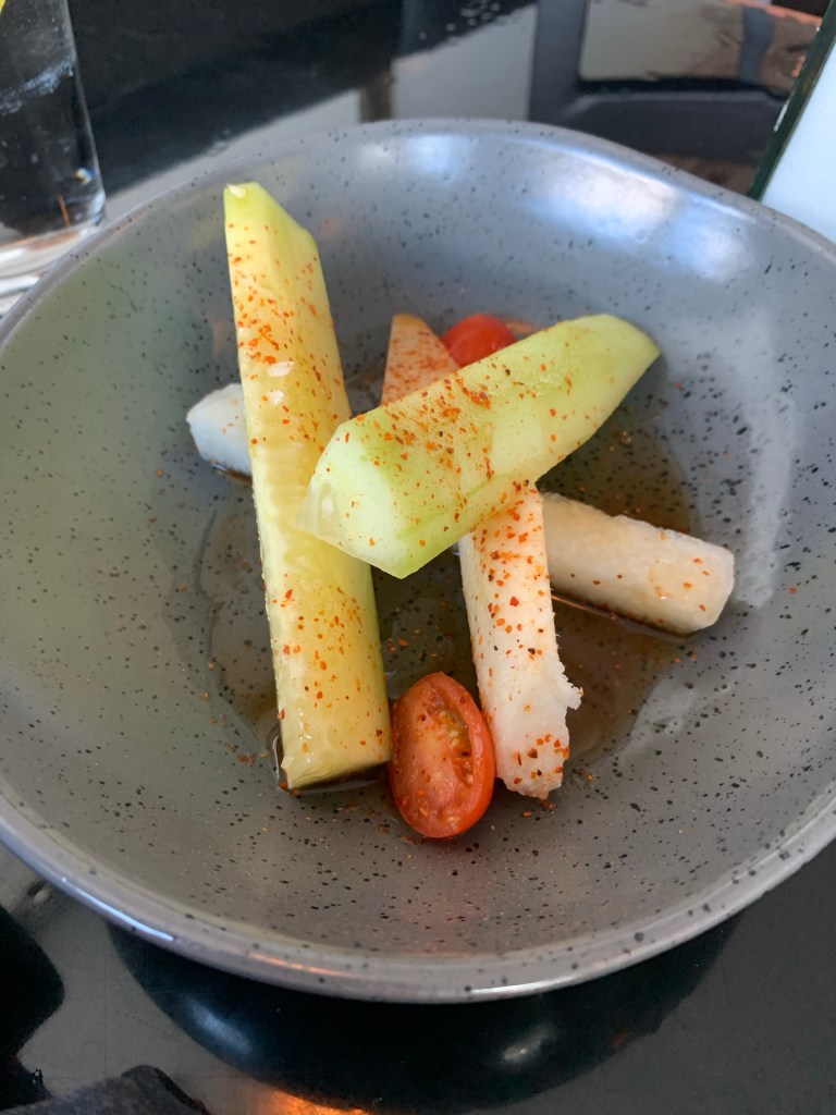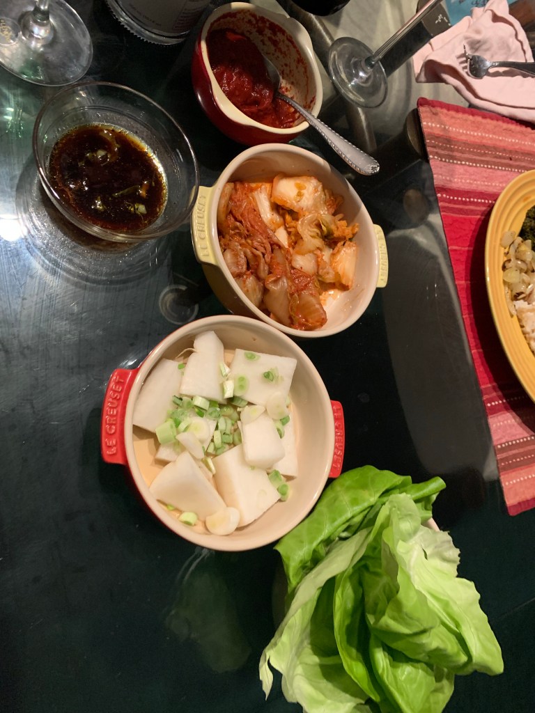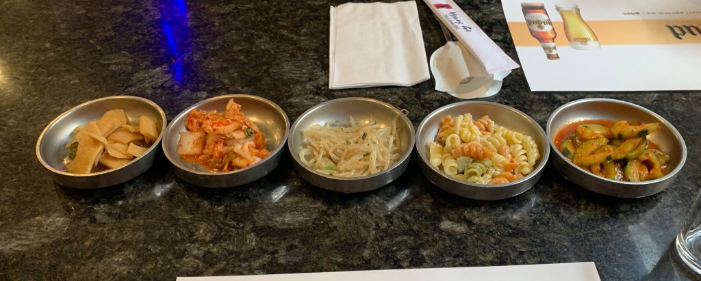 The Banchan were pretty typical—daikon slices in soy sauce and jalapeño, kimchi, slightly ferment sprouts, a great spice cucumber pickle, and a pasta salad (the latter is not unusual but always confusing).