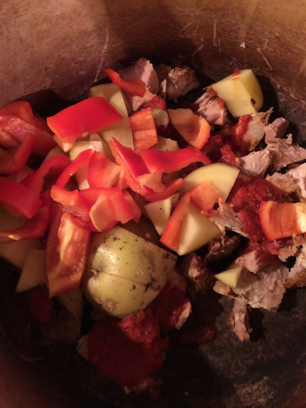 Oven simmered with potatoes, red pepper and a tomatillo simmer sauce