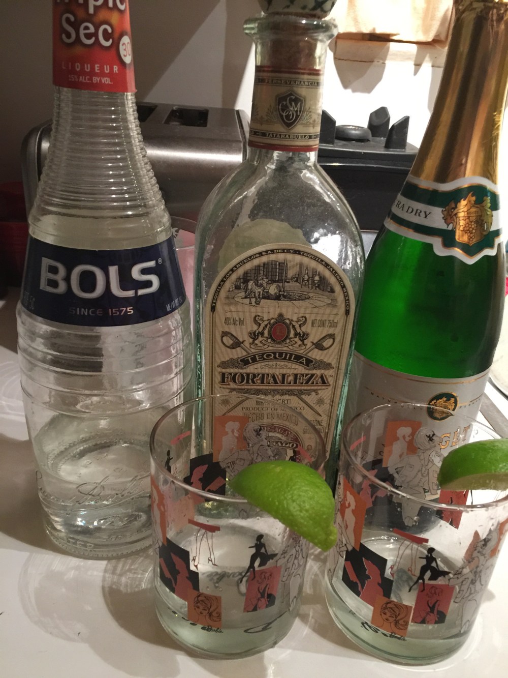 Jim doesnt like the cocktail and i love it….hes not liking the reposado flavor…so he should be good if i do over with silver.  For me, this is like sipping reposado without any bite and a hint of sweet but the sparkling wine was extra dry….shifting to asti would be a whole new drink!  This one is the juice of 1/2 lime, 1 pt tequila, 2 parts triple sec, 2 part sparkiling wine