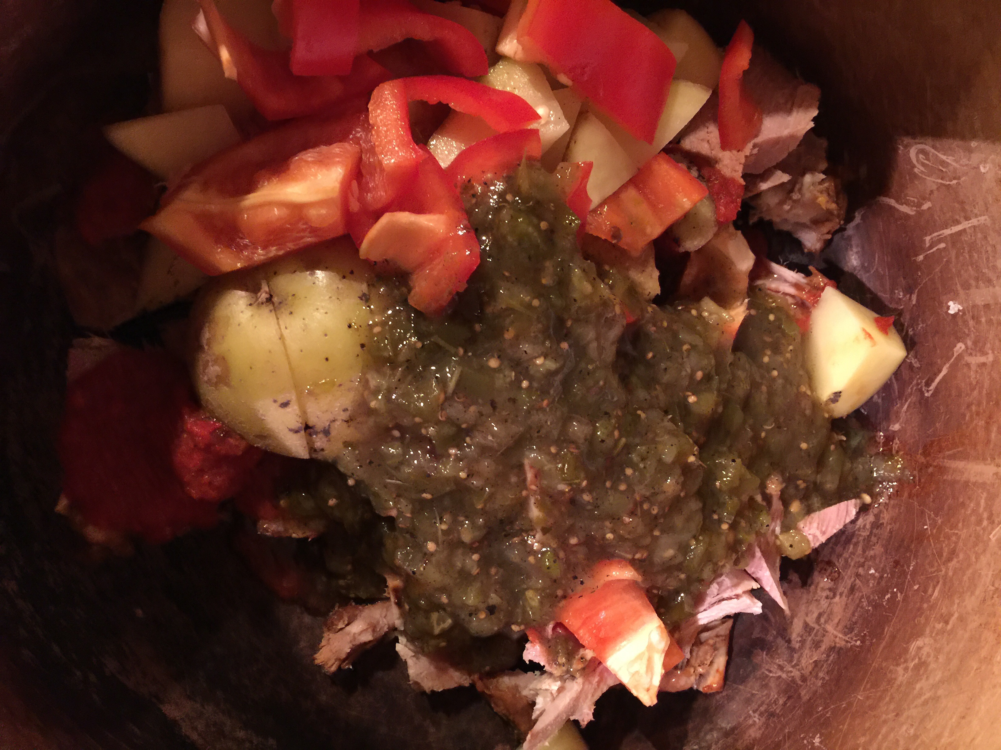 Oven simmered with potatoes, red pepper and a tomatillo simmer sauce