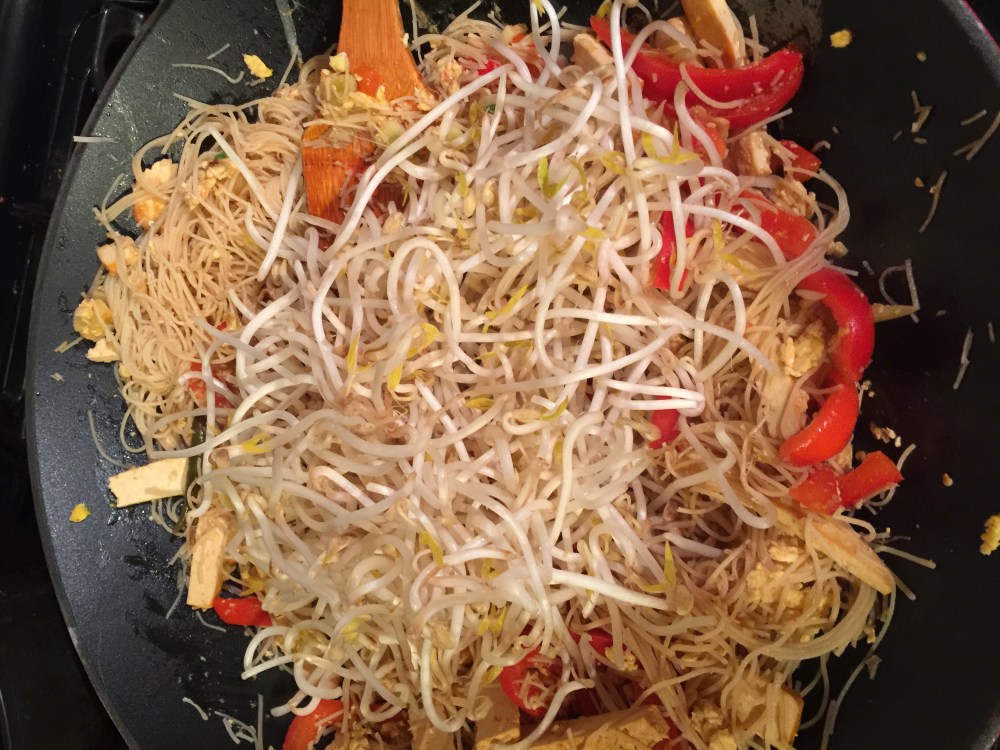 Next noodles, sauce (sugar, tamari, chili vinegar, coconut vinegar, pepper flakes) and after that gets a nice warming i added the sprouts.