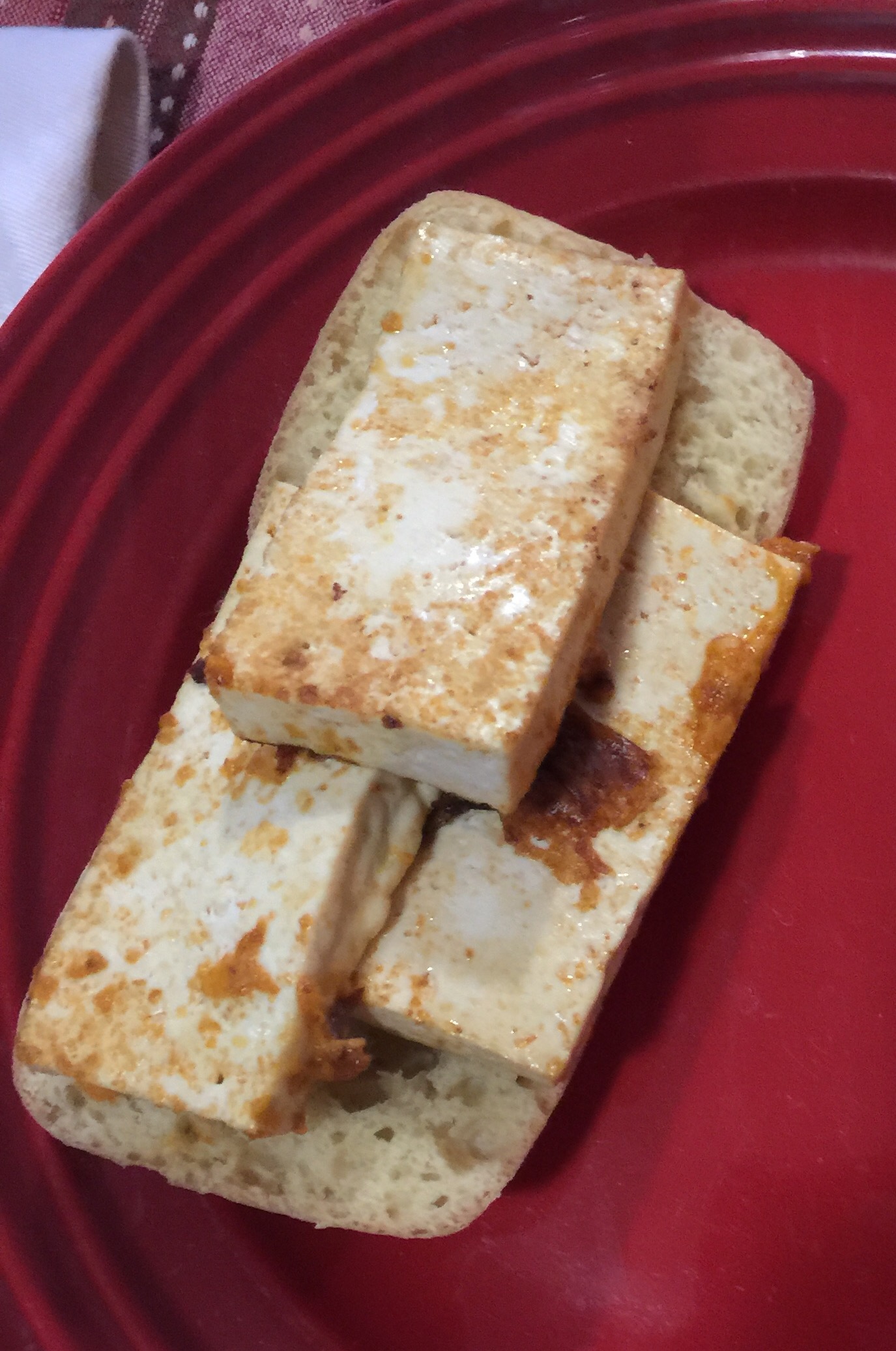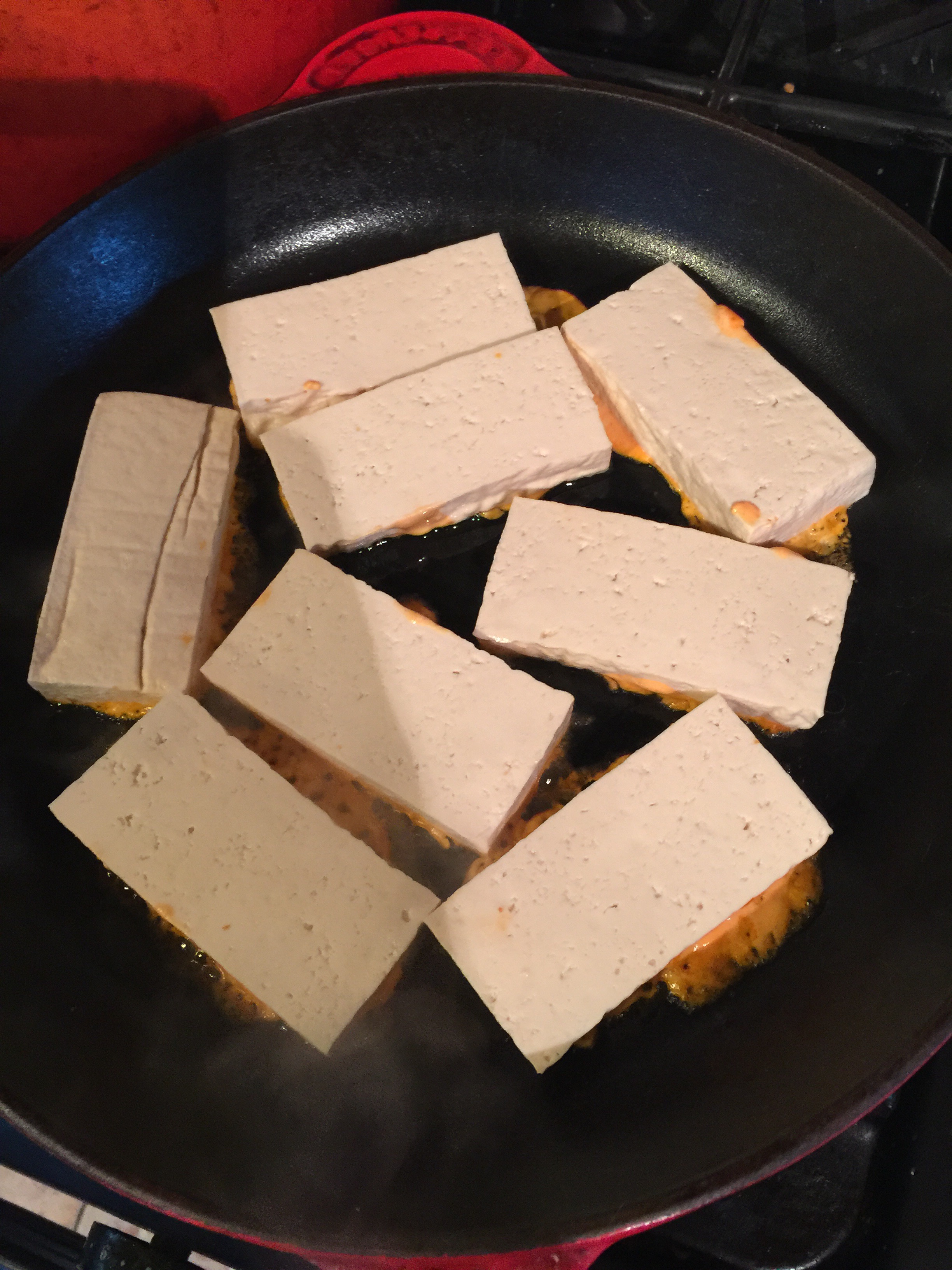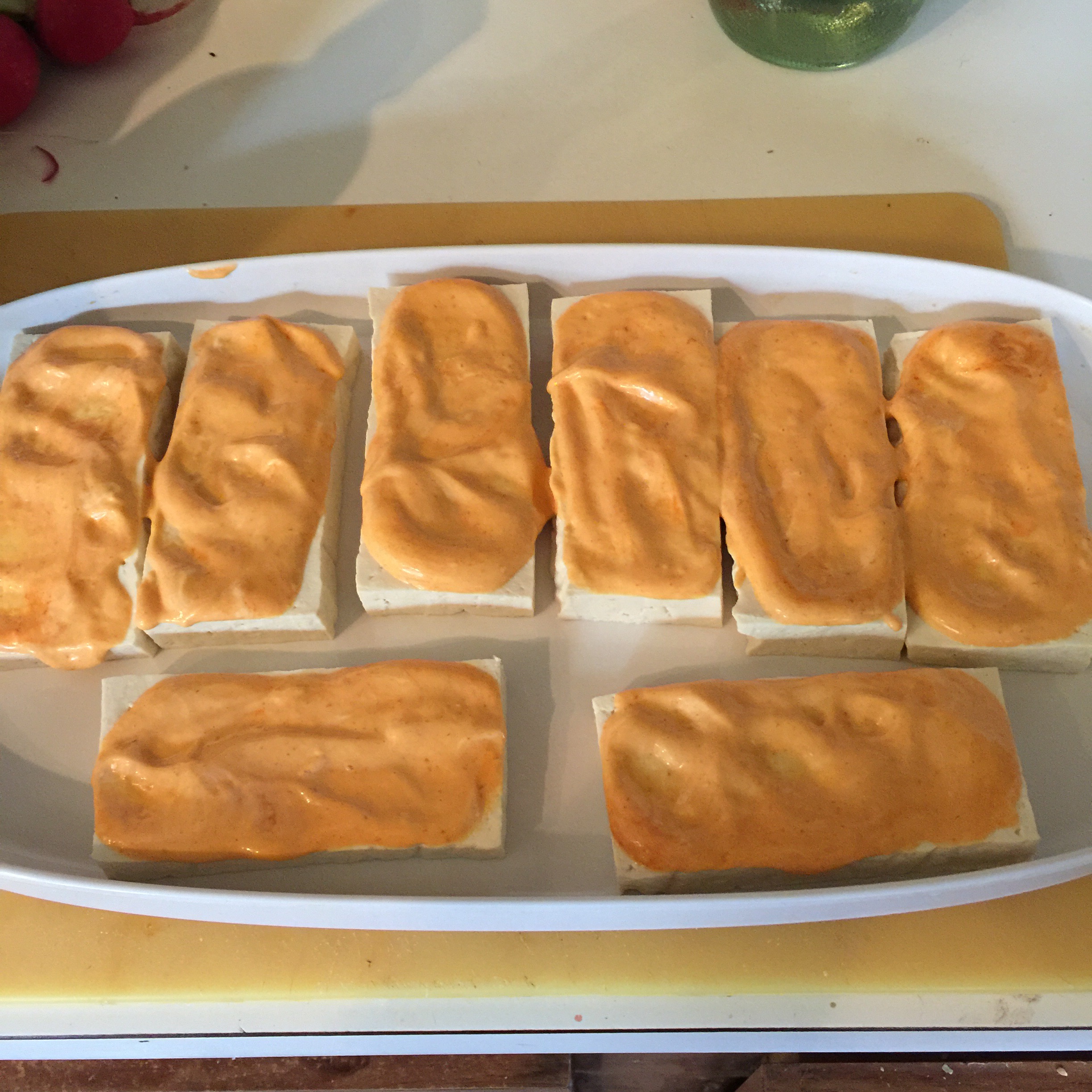The tofu is sliced into steaks and allowed to marinate with sriracha mayo: